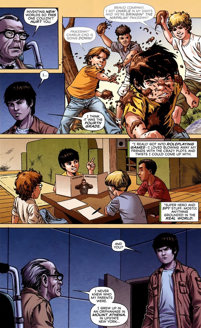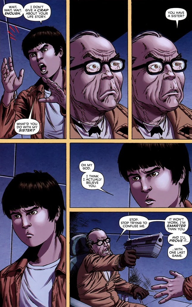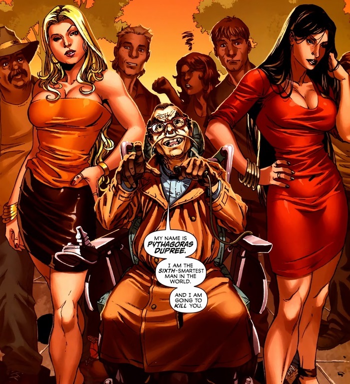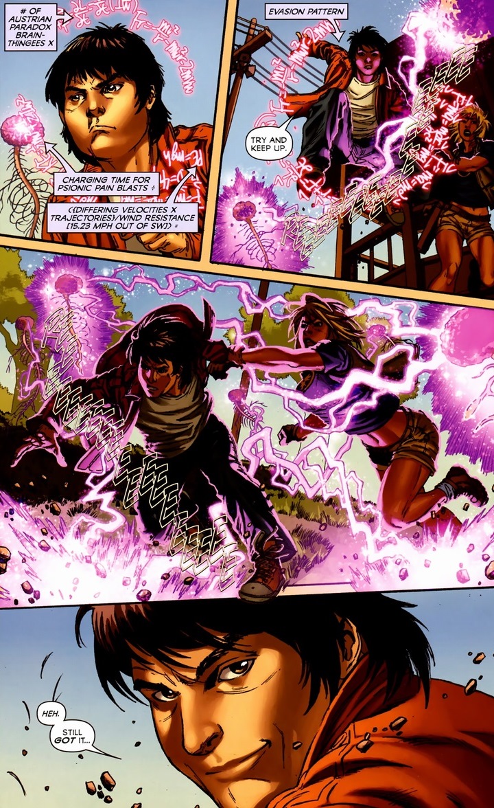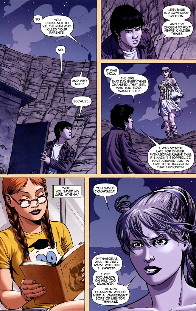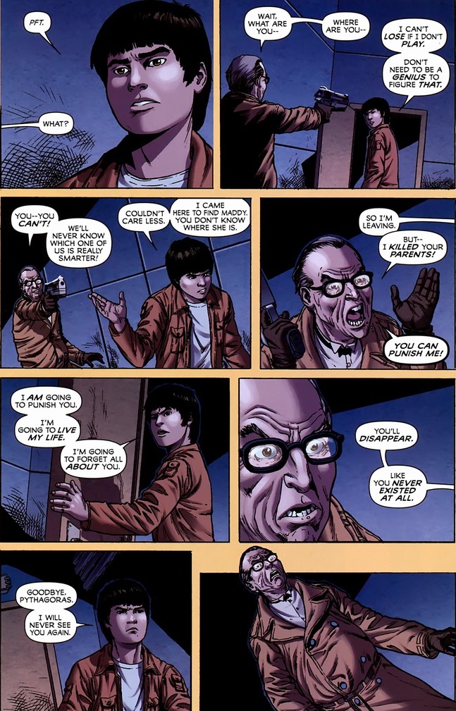 I’m going to skip a ton. The entire second issue of the arc revolves around a complicated D&D style game for control of Amadeus’ mind and the superior intellect of Pythagoras. It rocks and you should devote some time to finding the issue and reading it. But the final genius-off struggle between the two was what made me excited about this arc. Let’s get into it, but first, cue character development: