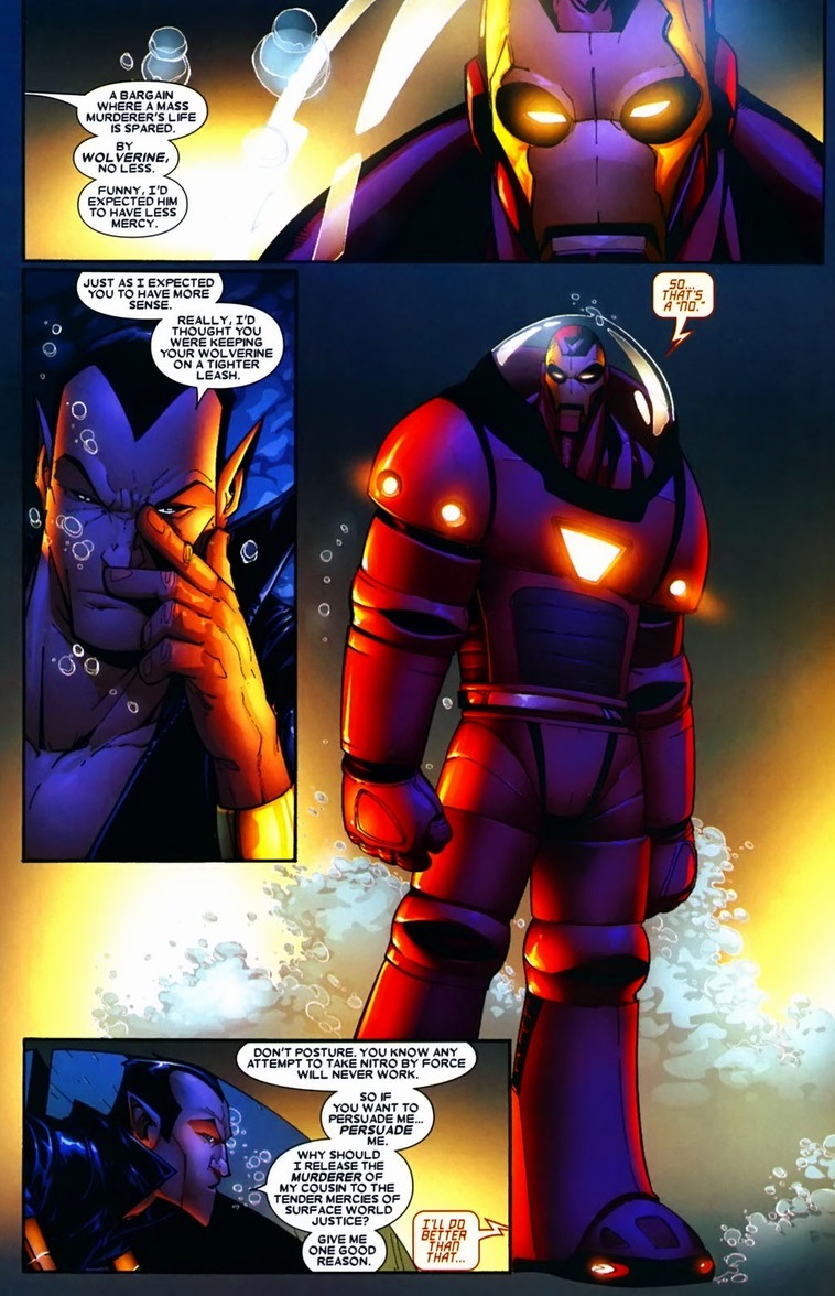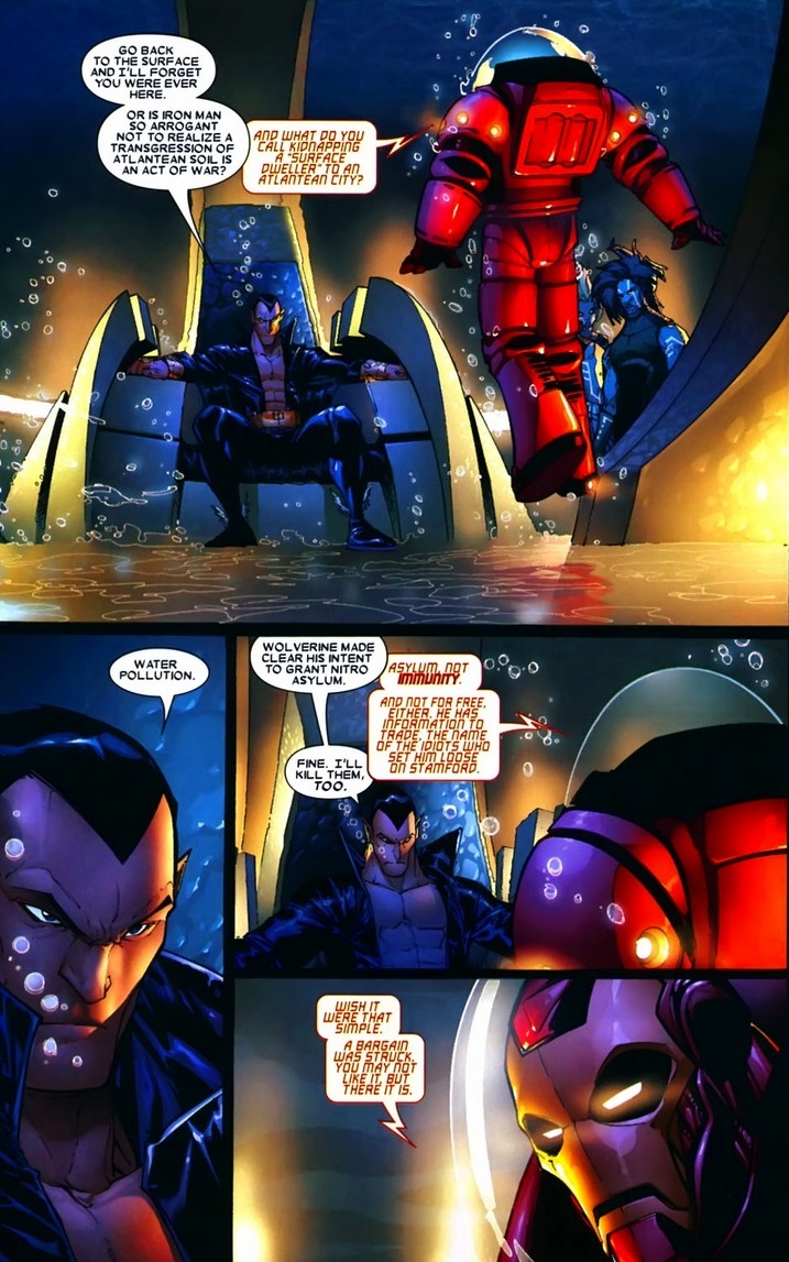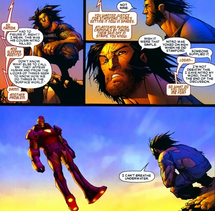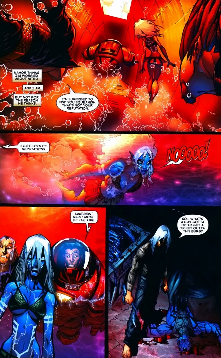 No, Wolverine’s not maturing. It’s just that after all the horror that happened the past few days, Wolverine realizes that he doesn’t really have a dog in this fight. Sure, Nitro has to pay for massacring 600 people and most of the New Warriors, but Namor and gang? Their vendetta stretches far greater than Wolverine’s ideals. Plus, and this may be the most important detail — no one tortures like the Atlanteans. Mephisto himself shudders in the deepest corridors of Atlantean prisons.