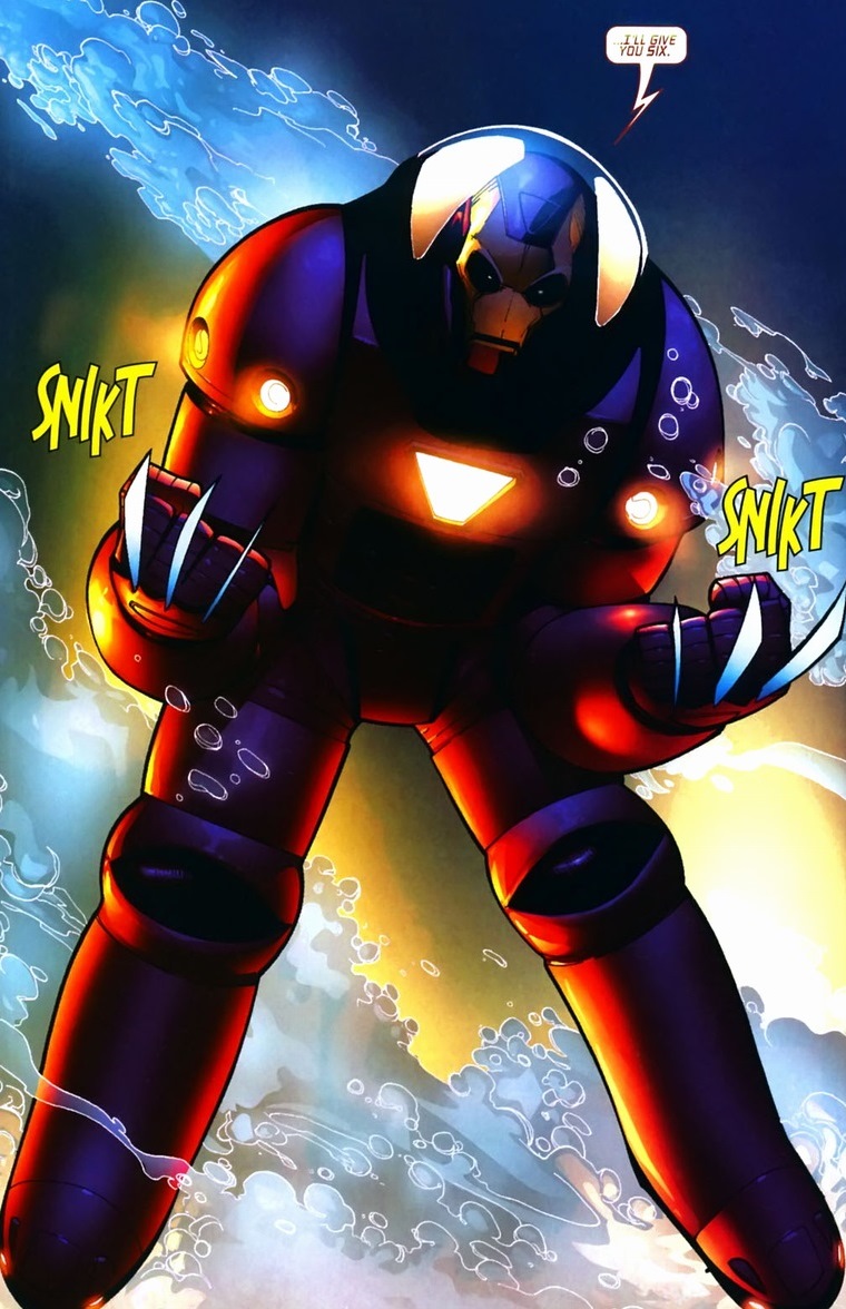 Round two goes as you think. Wolverine’s fighting Namor in the king’s natural habitat while Wolverine wields a slow, cumbersome suit of armor. Luckily, the fight gets interrupted — the Stamford killer causes a ruckus.