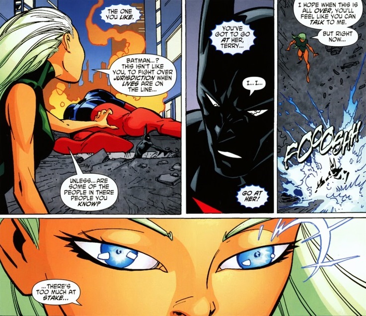 Posted: 06/27/2013 Filed under: DC, Fights 3 CommentsIf we stick to our theme of superhero cartoons turning into comics, Batman Beyond has done well for itself. Sort of. Sixty-ish issues over fourteen years shouldn’t be given medals or pats on the back, but anything done to have a short-lived cartoon survive over a decade past its ending must be a small victory in itself.