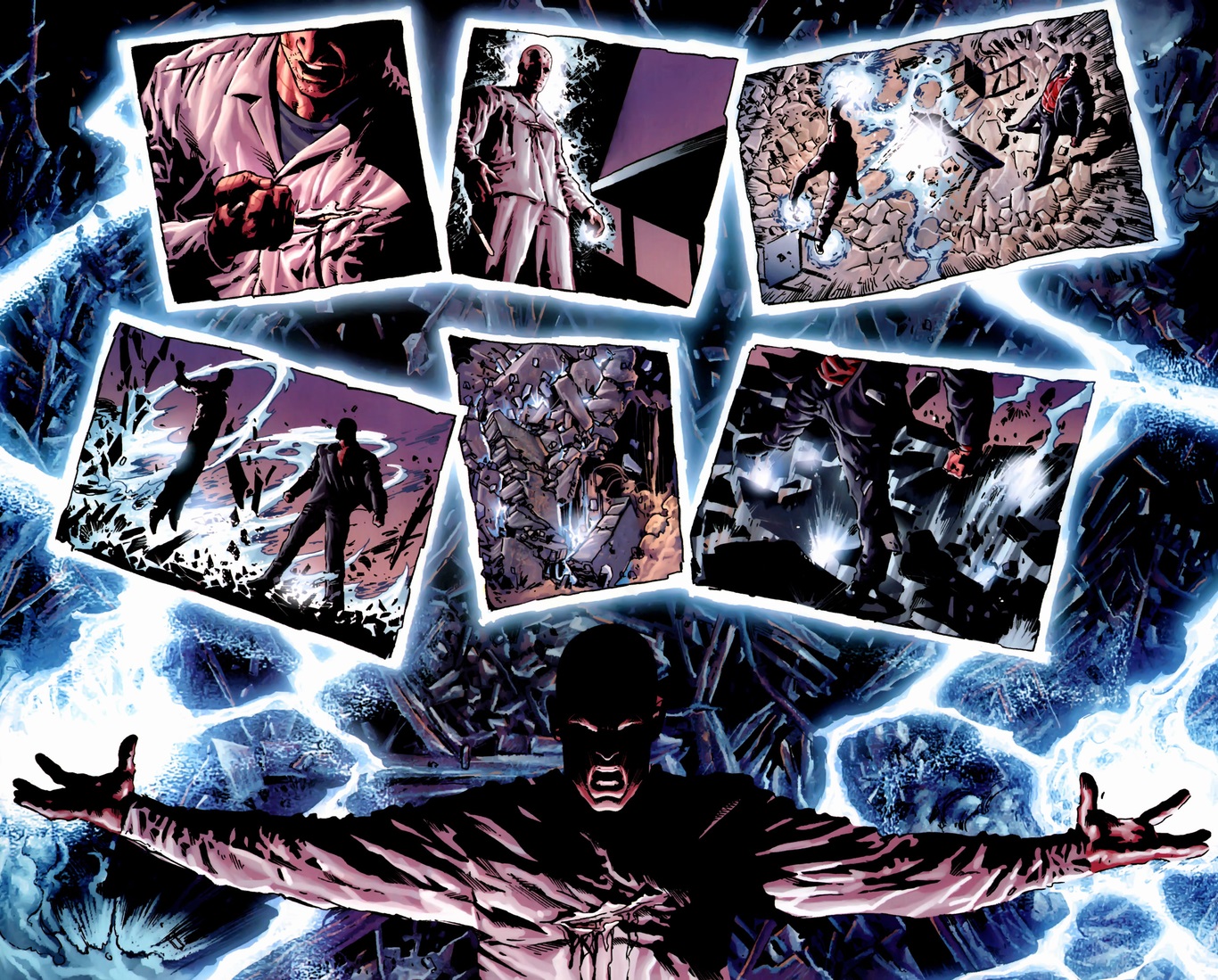 Without a good transition, we’ll finish today with Moon Knight, who I hold near and dear to my heart. With his origin I’m copying from a previous article of mine, soldier and martial artist Marc Spector stumbled upon the Egyptian moon god Khonshu who then gave him super powers.  Though you don’t have to remember all that jazz, because nowadays he’s a non-powered rich guy in a gadget-filled costume.  More importantly, he battles daily with his schizophrenia/multiple personality disorder.  But trust me, this is a superhero you want to become familiar with.  His most recent series covered his exploits struggling against organized crime in Los Angeles, and the volume before that dug deeply into Spector’s faith, spirituality, and personal demons.  Also, he kicks a whole bunch of ass, like as in these scenes from Moon Knight #12 (volume seven, written by Brian Michael Bendis and drawn by Alex Maleev) and Moon Knight #30 (volume six, written by Mike Benson and drawn by Jefte Palo):