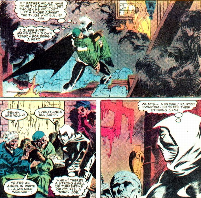Moon Knight then goes and does what Jews always dream about: take down a gang of Neo-Nazis. While Captain America bonks Nazis all the time in his adventures, the satisfaction that comes from Nazi blood on the end of a Jewish fist makes the victory much sweeter.  The good captain represents the best of American idealism and patriotism, but there’s nothing Jewish about him.  Let Moon Knight handle this, for his vengeance bathes in a slightly richer light.
