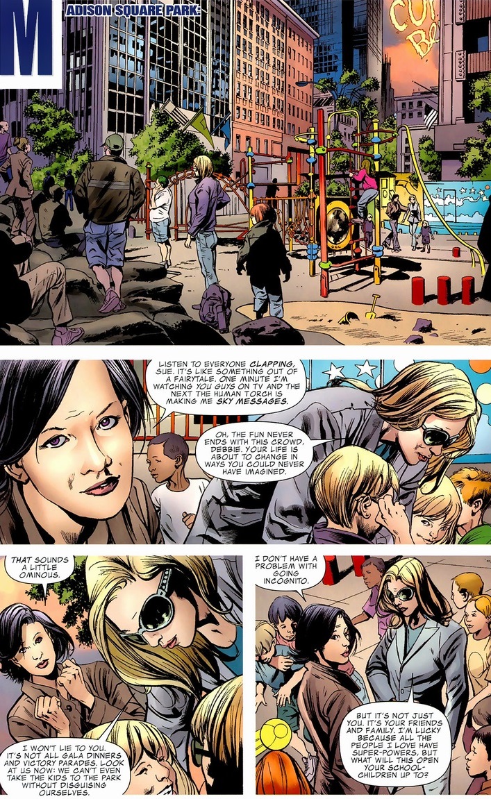 Mr. Fantastic’s marriage is fine.  Sort of.  Now, the Fantastic Four have a unique position in the superhero world.  Think of the team as a business.  They possess no secret identities and the Baxter Building (where they live) is well-known and prominent in the New York skyline.  Reed supports the family through government contracts and patents while occasionally taking a break to defeat Galactus or whatever.  None of them are public menaces.  I’m just saying Spider-Man waltz into a school.