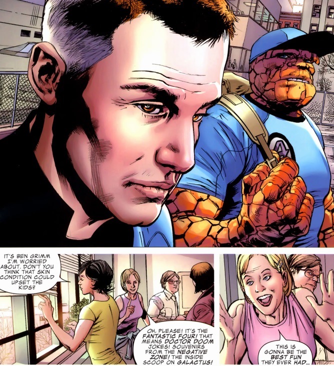 By the way, the final arc of Millar’s run contains one of the best Fantastic Four vs. Dr. Doom battles ever written.  You should treat yourself.  Anyway, our story begins innocently enough. When not saving the world, the Fantastic Four like to do some philanthropic work, and what student wouldn’t enjoy an appearance by respectable, lovable superheroes?