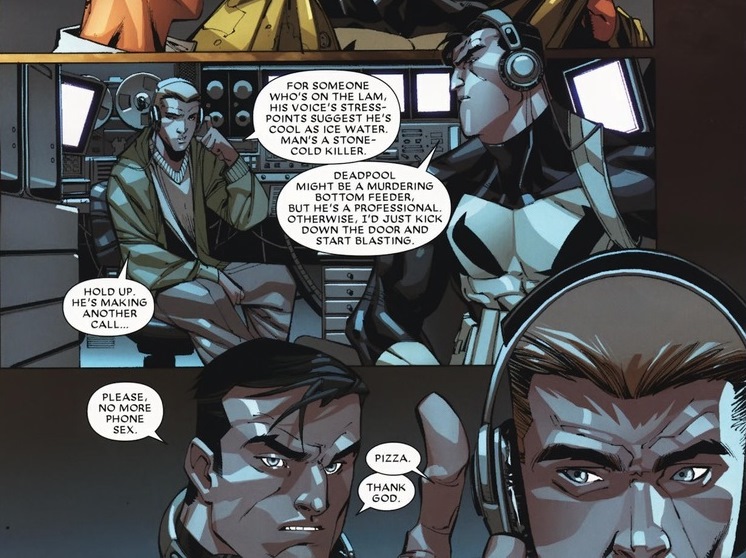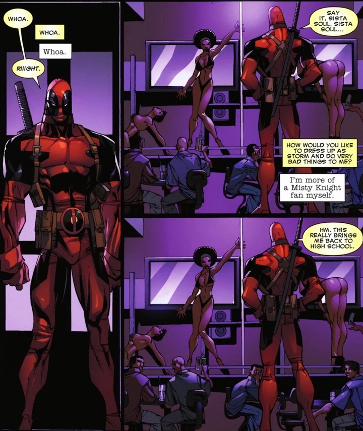 Yes, Deadpool’s unapologetic pervertedness and overwhelming creepiness show a sharp contrast from the white knights currently patrolling the Marvel universe.  I’m not saying Deadpool’s better, I’m saying that the writers don’t care and that allows a sort of disgusted freedom.