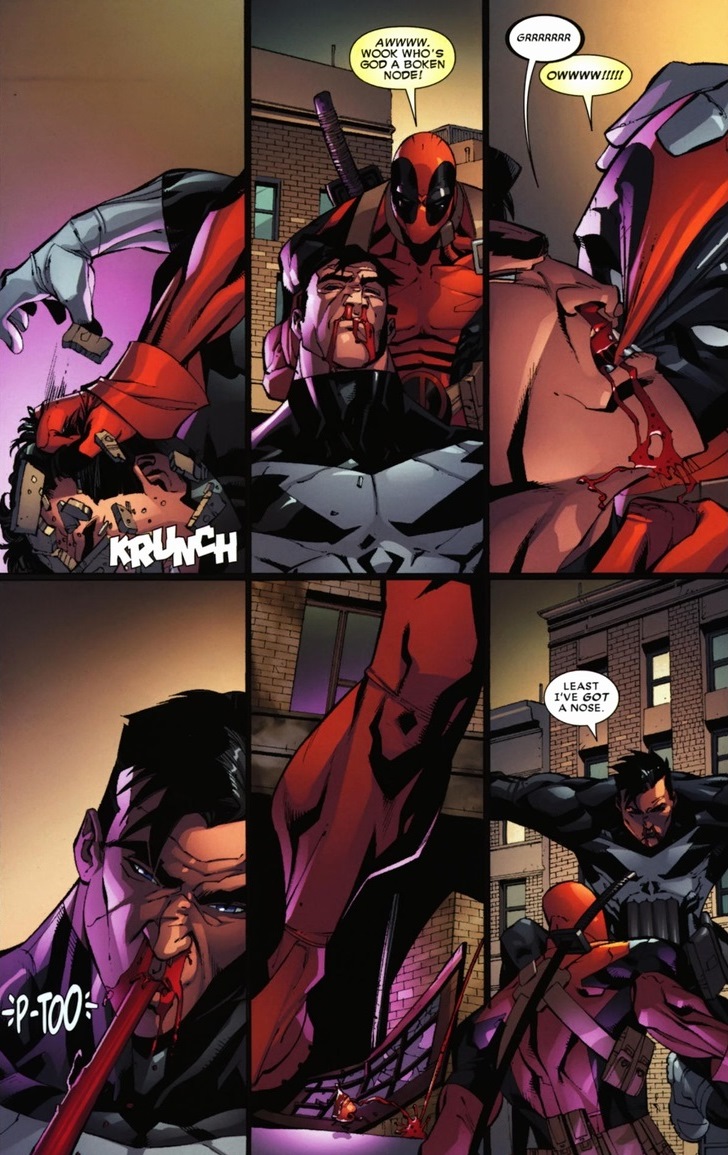 I enjoy the contrast of Punisher and Daredevil teaming up with Deadpool, if only because those two are probably the least funny superheroes in the Marvel universe.  I’ve seen Captain America make more jokes.
