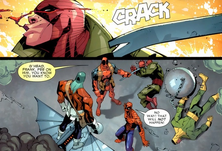 Deadpool holds a firm distinction of being the only superhero disliked by every other superhero in the Marvel world.  Even the Punisher has a on-and-off friendship with Wolverine. But Deadpool’s obnoxious, and we as readers understand that.  With all the tragedy and grief oozing over the superhero world, it’s nice to have a comic so bright and silly.  And speaking of the Punisher, the three New York City “street” heroes (Punisher, Spider-Man, and Daredevil) all hold prominent roles in the miniseries.  Having normal superheroes interact with Deadpool remains half the fun.  Like when Frank Castle taps Deadpool’s phone: