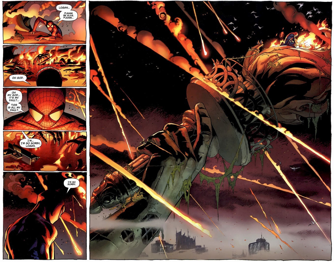 Spider-Man mourns, because while the two don’t enjoy each other’s company, it’s going to be hard for Spider-Man to explain to the superheroes back home that Wolverine disintegrated himself on a monkey planet against an evil moon-like object.