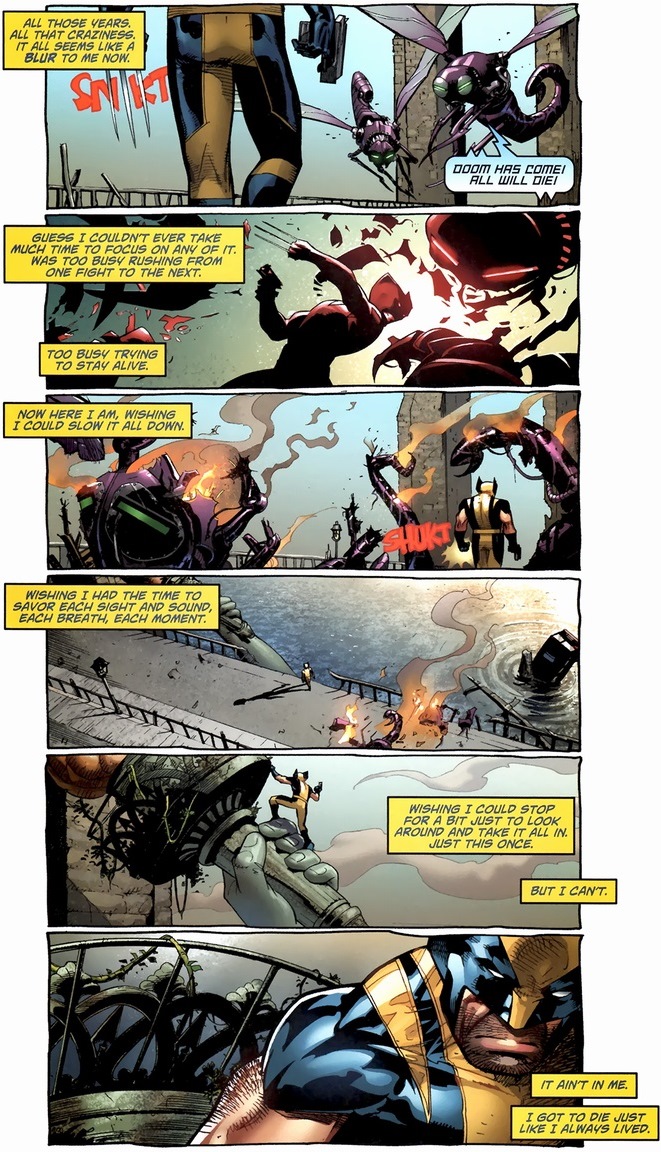 I like the next few pages as Wolverine walks morosely towards his own death. It’s a combination of shameless bragging mixed with shameful regret. And by the way, don’t feel bad for Wolverine. The man’s a hundred years old, has back hair that rivals most zoo animals, officially stands at 5’3″, repeatedly told how awful he smells, and has a remarkably unlikable personality. Yet his life has been pretty freakin’ awesome. Here, let Wolverine explain: