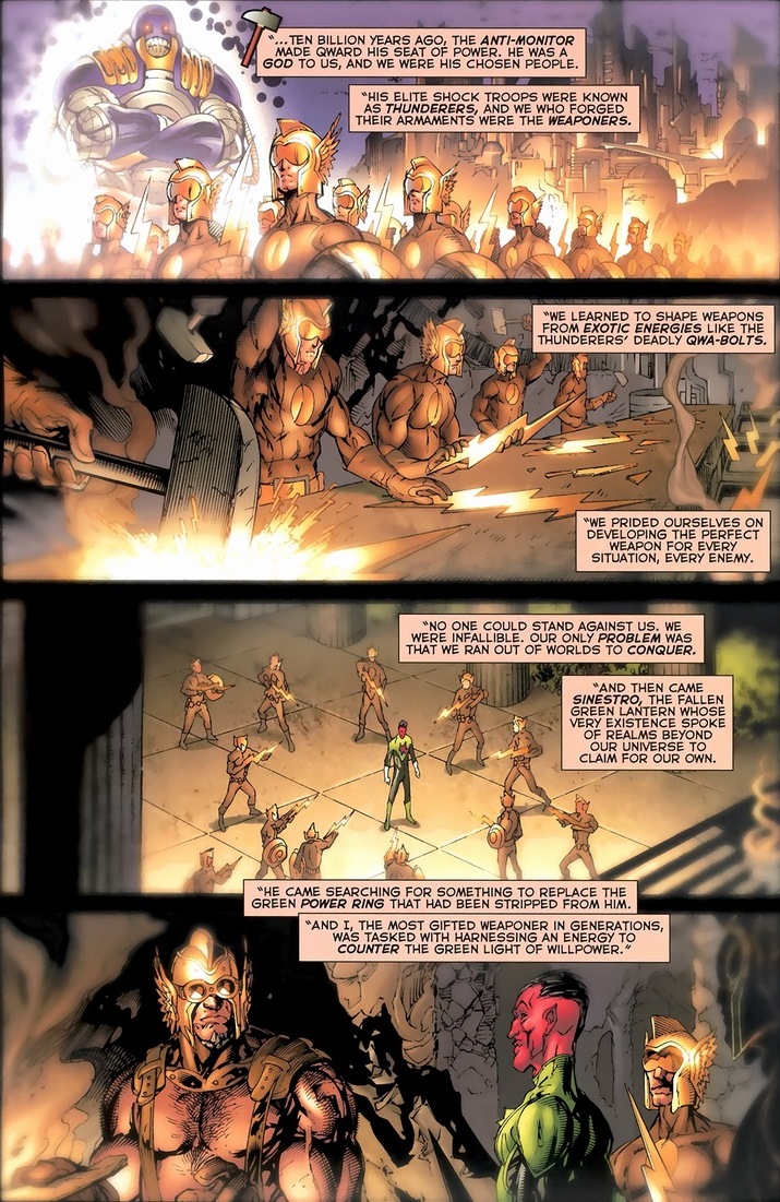 The Weaponer! How does he know so much about the capabilities of the Green Lantern ring? Y’see, when Green Lantern arch-nemesis Sinestro betrayed and left the corps, he went to the Weaponer to forge him a new ring. He chose yellow (because of the weakness Green Lantern rings possessed to it — not anymore, but back then) and his ring charged on the ability to instill fear into others. Now the Weaponer shows up on Korugar, Sinestro’s home planet, looking for his former client.