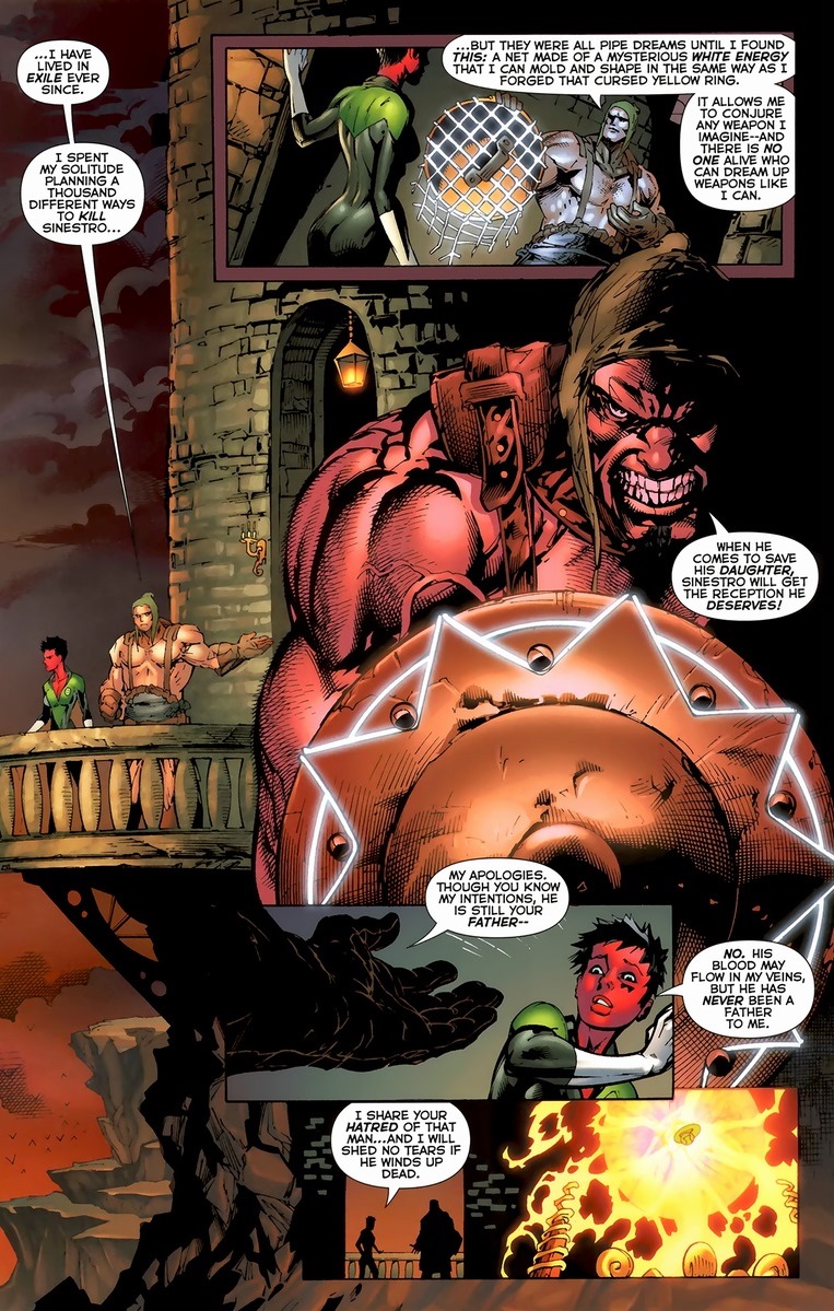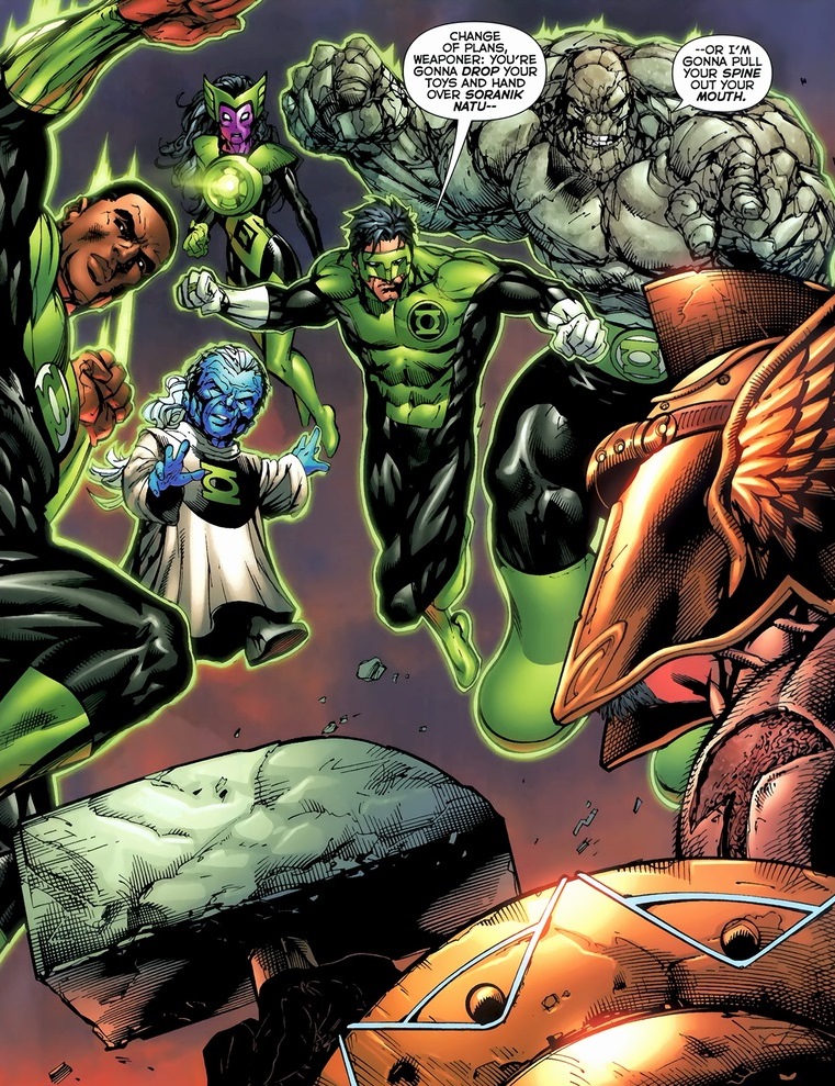 Sinestro totally birthed a daughter. Though like most supervillains, his parenting skills include both emotional and verbal abuse. Throw some neglect in there too. Sinestro really only has time for Sinestro. More importantly, his daughter (and Green Lantern) Soranik Natu currently dates our protagonist. So you can imagine Rayner’s eagerness to follow Weaponer’s instructions. Unfortunately, like our government, Sinestro won’t respond to terrorists or threats. More unfortunately, superheroes’ inability to persuade others almost always leads to one option: