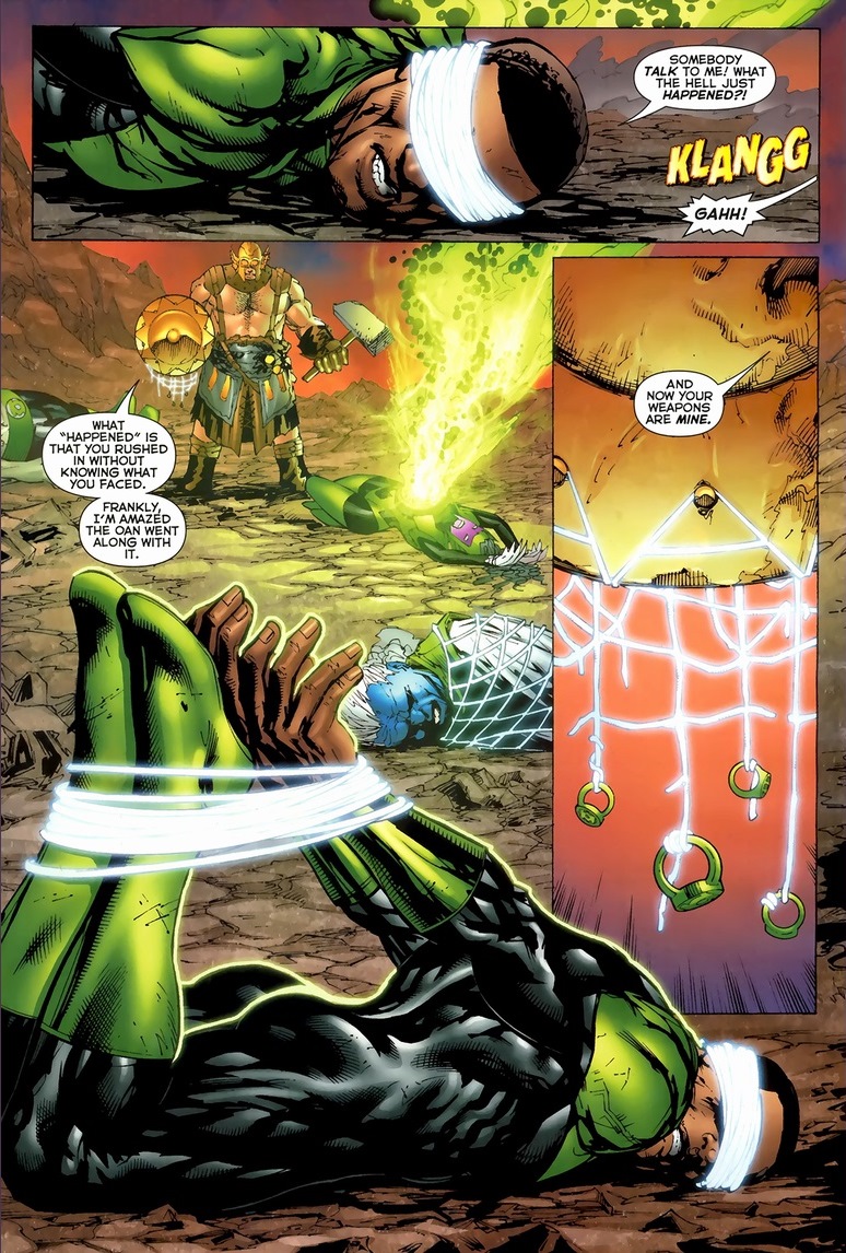 Solid team Rayner assembled. You have U.S. Marine John Stewart, Alpha Lantern/robot Boodikka, rock monster Hannu, and Ganthet, an actual Guardian of the Universe turned Green Lantern. They lose. Badly.