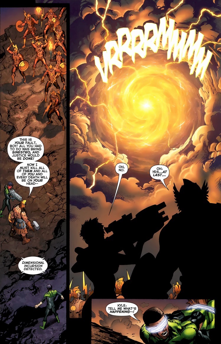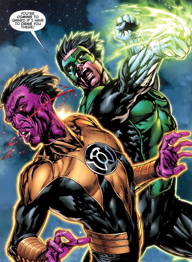 In Green Lantern Corps #53-57, written by Tony Bedard and drawn by Tyler Kirkham, our heroes in the intergalactic police force (Green Lantern Corps) signed a truce with Sinestro’s aptly named Sinestro Corps, Bigger fish to fry than rainbow laser fights, I guess. But during a dual rescue operation between the two corps with the usual machismo, Green Lantern Kyle Rayner witnesses this: