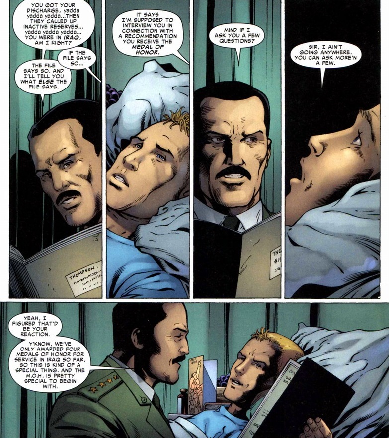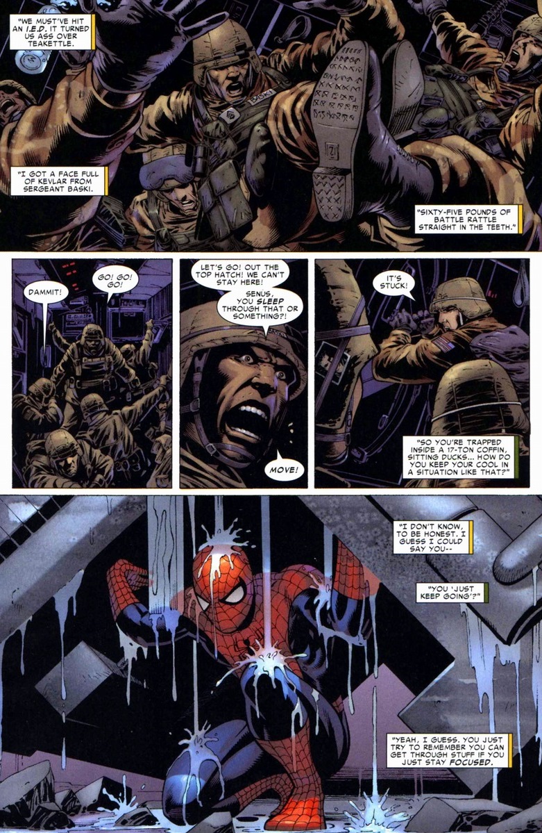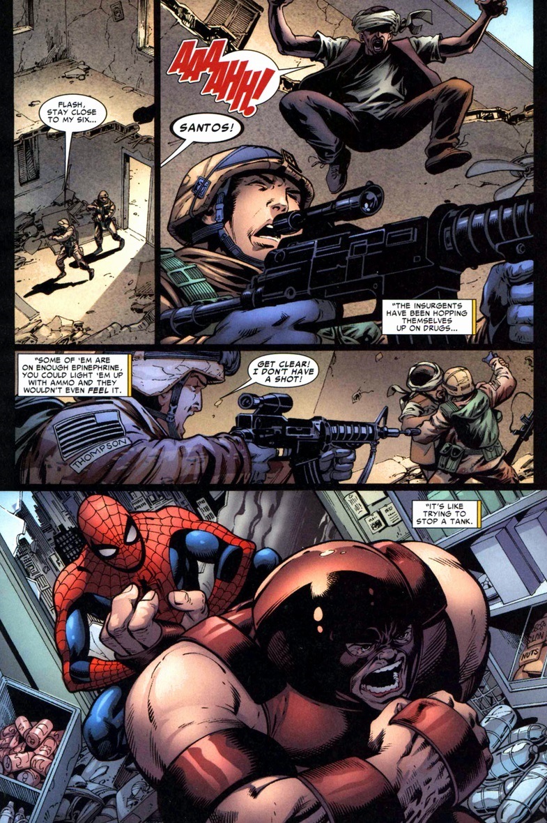 As you can imagine, Flash handles the PTSD badly.  He dives into some serious alcoholism — the same disease that affects his father –although he does become one of Parker’s dear friends as well (watching a village or two explode sort of makes bullying seem petty).  Then the Green Goblin puts him in a coma.  Bad times.  Eventually time heals all wounds, as Flash awakens and trains young minds in the art of dodgeball and stuff as a P.E. coach.  But when war in the Middle East rears its ugly head in the late 2000s, Flash steps up to serve his country.  And thus begins one of the most powerful stories ever told in a Spider-Man comic.