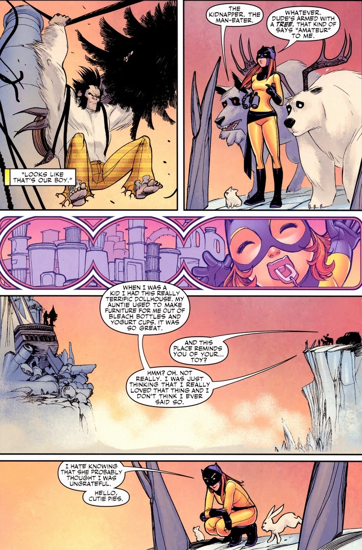 Posted: 10/10/2013 Filed under: Characters, Marvel 2 CommentsToday, she saves Alaska! When we left off Wednesday, Hellcat, the chipper martial artist who can sniff out magic, gathered up a crew of talking animals and traveled the tundra to save the shaman’s daughter from a scary monster. A scary monster that wears striped pants. If you forgot the feel good insanity of this story, allow me to remind you: