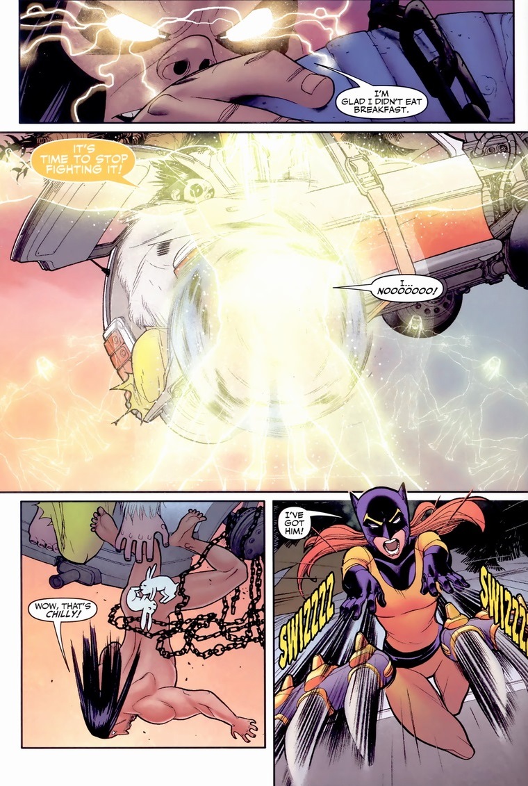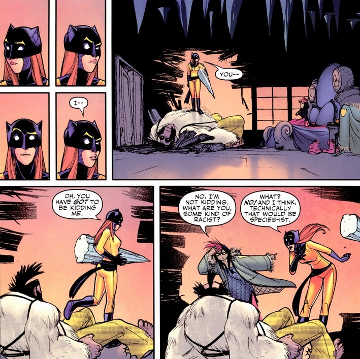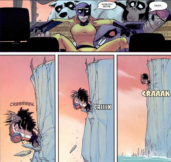 Look, a superhero needs skills beyond kickboxing. They have to be emotionally aware, able to counsel traumatic victims and use their words to defuse a situation before anything gets any worse. Sometimes that can be accomplished with threats, logic, or tugging on those heartstrings. But Hellcat has to deal with a teenager, and while I absolutely do not endorse this method of debate, it’s surprisingly effective: