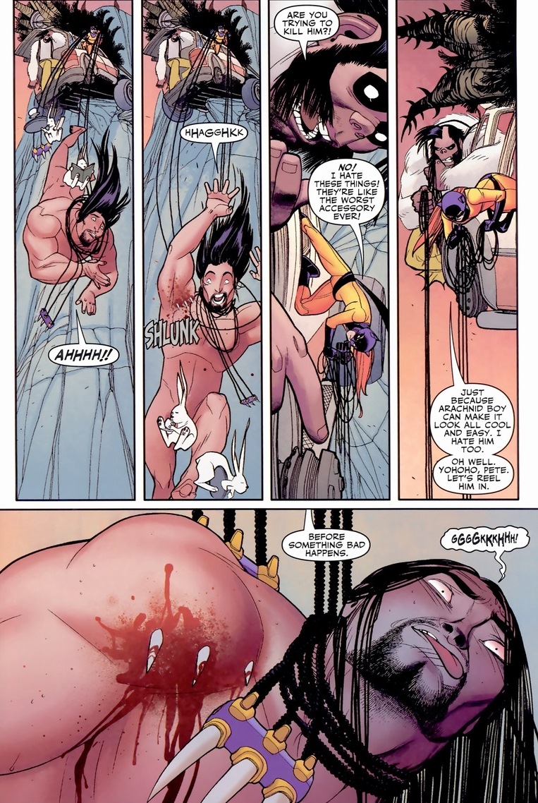 Lafuente’s a skilled artist to have the rabbits conveniently hide a character’s private parts mid-fall. Finally, and after a few bandages (physical and emotional), our story can end happily and satisfactorily. Thankfully, silly stories always end that way. Bullseye doesn’t jump out of a helicopter and behead the yeti with a playing card, because that would absolutely be a real fear in a Daredevil comic.