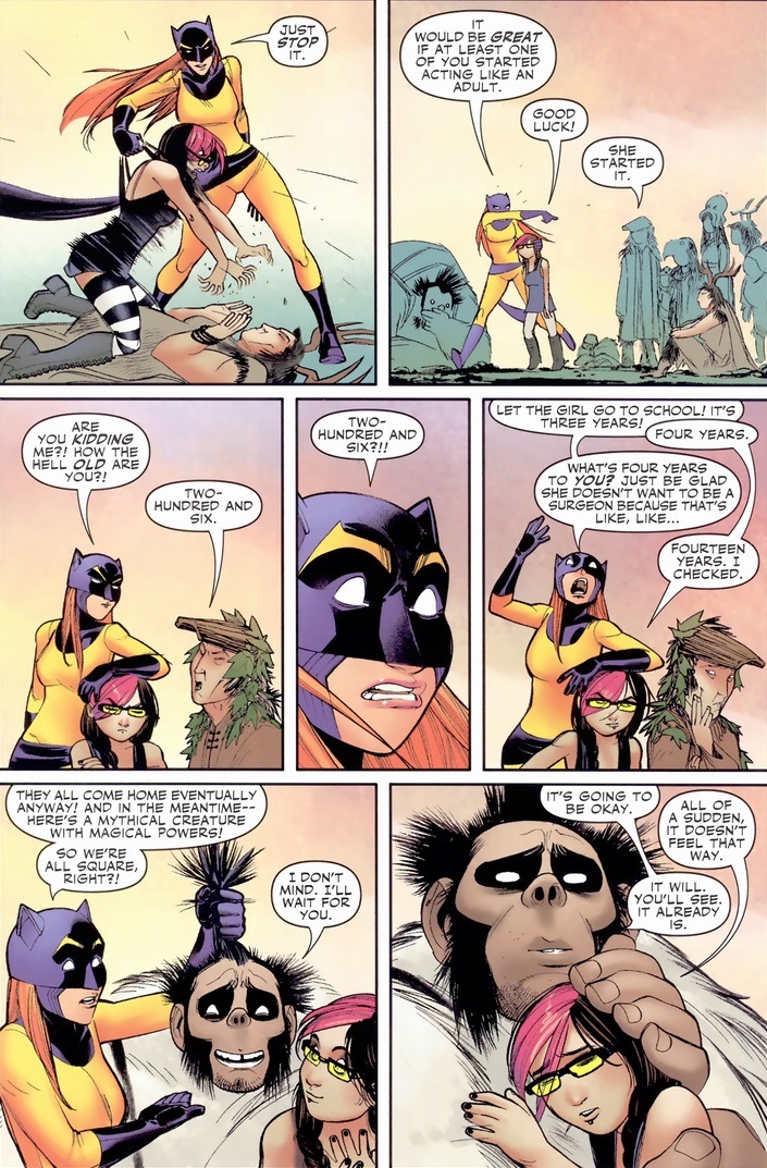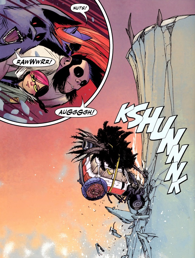 Because we’re reading a comic, even a delightful one like this, Plan A always fails. Always. In this case, two women, a few talking animals, a yeti, and a giant stone map can weigh down a jeep. Especially a jeep that wants to jump a deep crevice. But remember Hellcat’s power to detect magic? Turns out yetis dabble in wizardry.