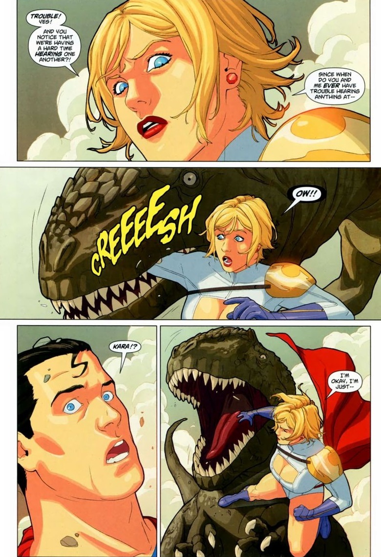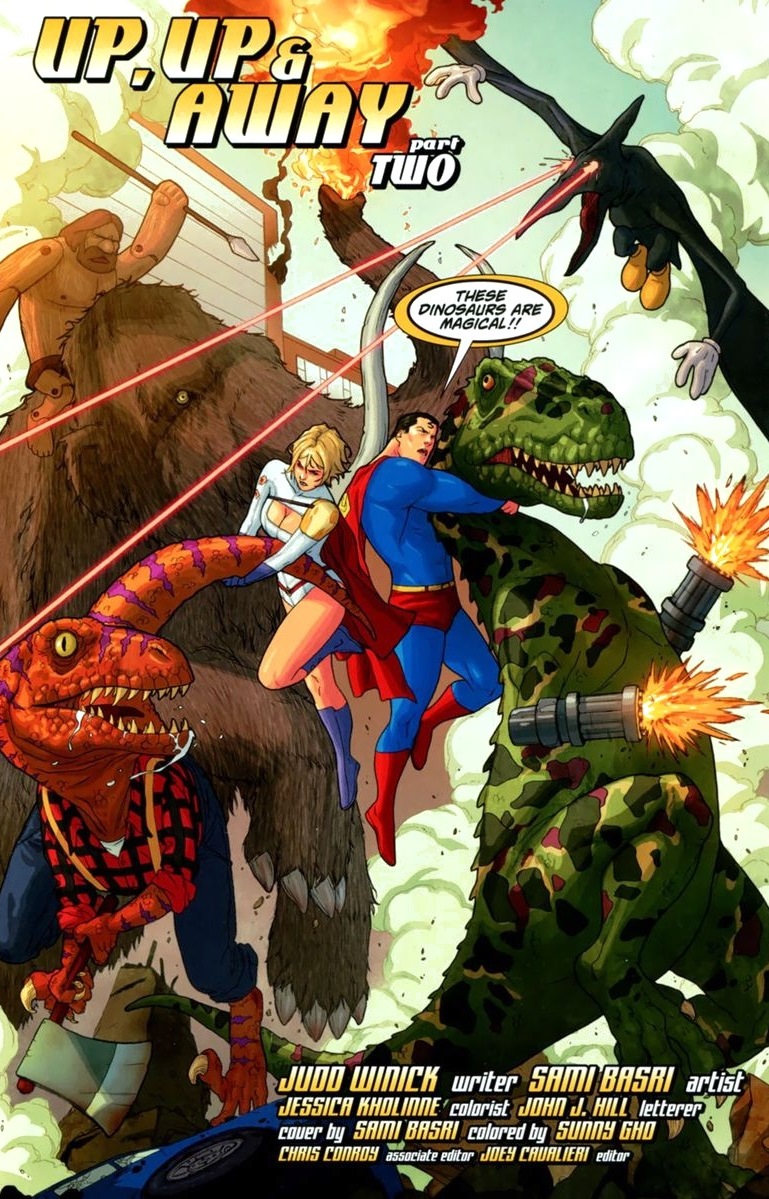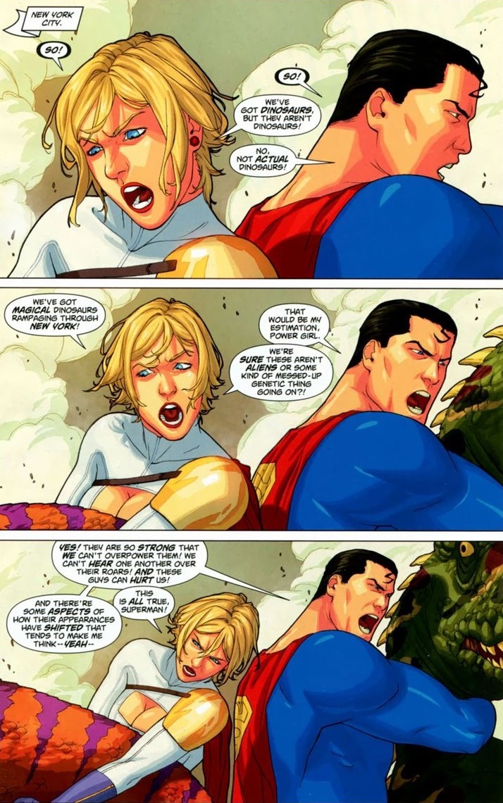 Posted: 10/15/2013 Filed under: DC, Fights 1 CommentAlongside Superman and Zatanna, but they get plenty of coverage elsewhere. Fresh off Power Girl’s loss against Wonder Woman last article, I figure our Earth-Two Supergirl deserves some spotlight of her own. Plus, her solo series remains one of my absolute favorite comics in the pre-New 52 era of DC comics. That and Batgirl. So let’s watch her battle prehistoric monsters in Power Girl #22-23, written by Judd Winick and drawn by Sami Basri. Because you deserve it.