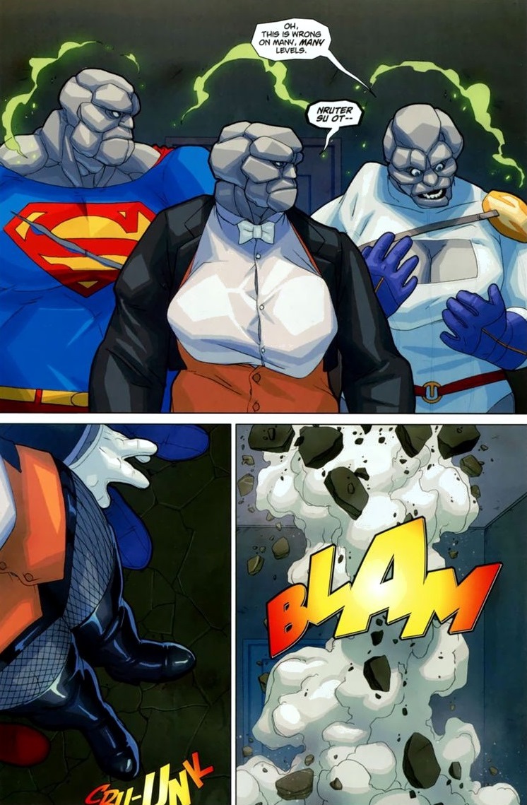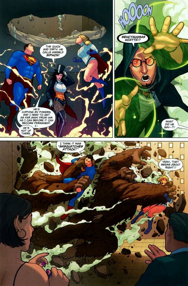You can YouTube the song if you want. Sting sings it. Finally, our antagonist gets to fight for his victory. No more lumberjack minigun-toting dinosaurs to back him up. How Superman and Power Girl find him matters far less than that Superman and Power Girl do find him.