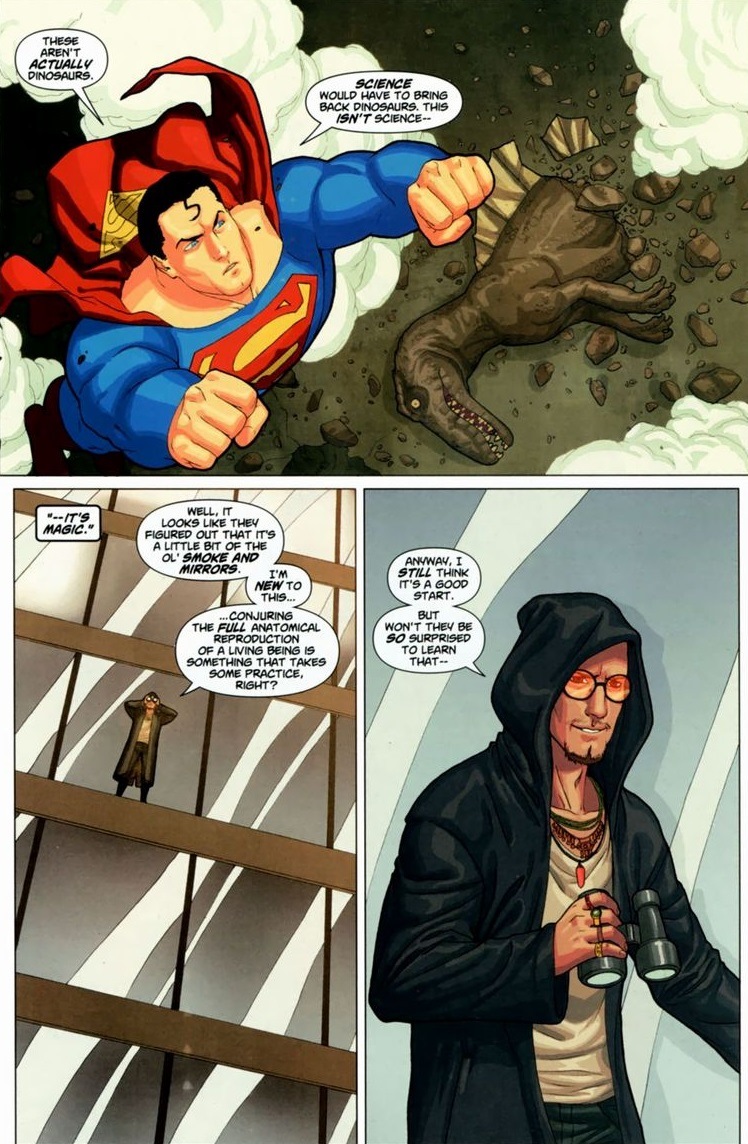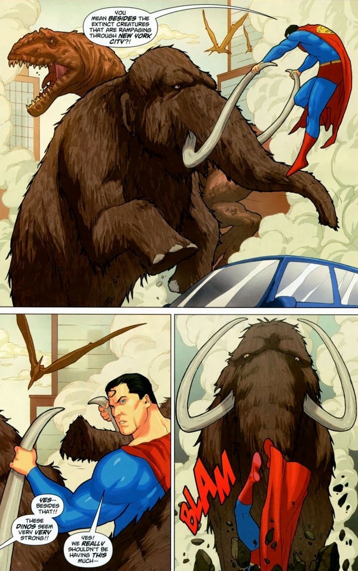 The Superman family possesses some very popular and famous weaknesses. Kryptonite, obviously. Doomsday punches, I guess. But because of the scientific nature of Krypton and their acquisition of powers, the Superman family also has no resistance to magic. While normal dinosaurs require braces after chomping down on Superman or Power Girl (or Supergirl or Superboy or Krypto or Comet the Super-Horse or Streaky the Supercat or Beppo the Supermonkey — the 1960s were a weird time for Superman comics), magical dinosaurs slice right through that invulnerable skin of theirs. And just because Superman doesn’t have the genius intellect of Batman, it doesn’t mean he can’t investigate quandaries in his own way — usually flying through stuff.