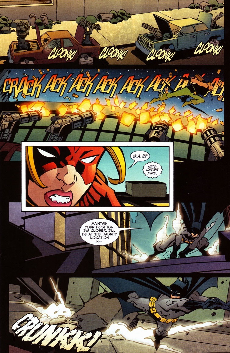 She’s made a joke so chilly that you could feel your own body temperature drop as you read it.  Most importantly, she committed the most egregious of superhero mistakes — she made herself a fool in front of Batman.  I imagine when the Dark Knight pops up to aid your crime watch, the thought is less “thank god” and more “dammit, now I have to be perfect.”  Batman judges.  Batman never makes errors.  Batman only glares and criticizes.  Why do you think every Robin that pops out of his teenage kung fu immersion camp comes out as a total badass?  No choice when their mentor is the epitome of human capability.  Physically and mentally.  And he expects everyone who would wears that red and green underwear beside him to be the exact same way, no matter how recently Robin hit puberty.