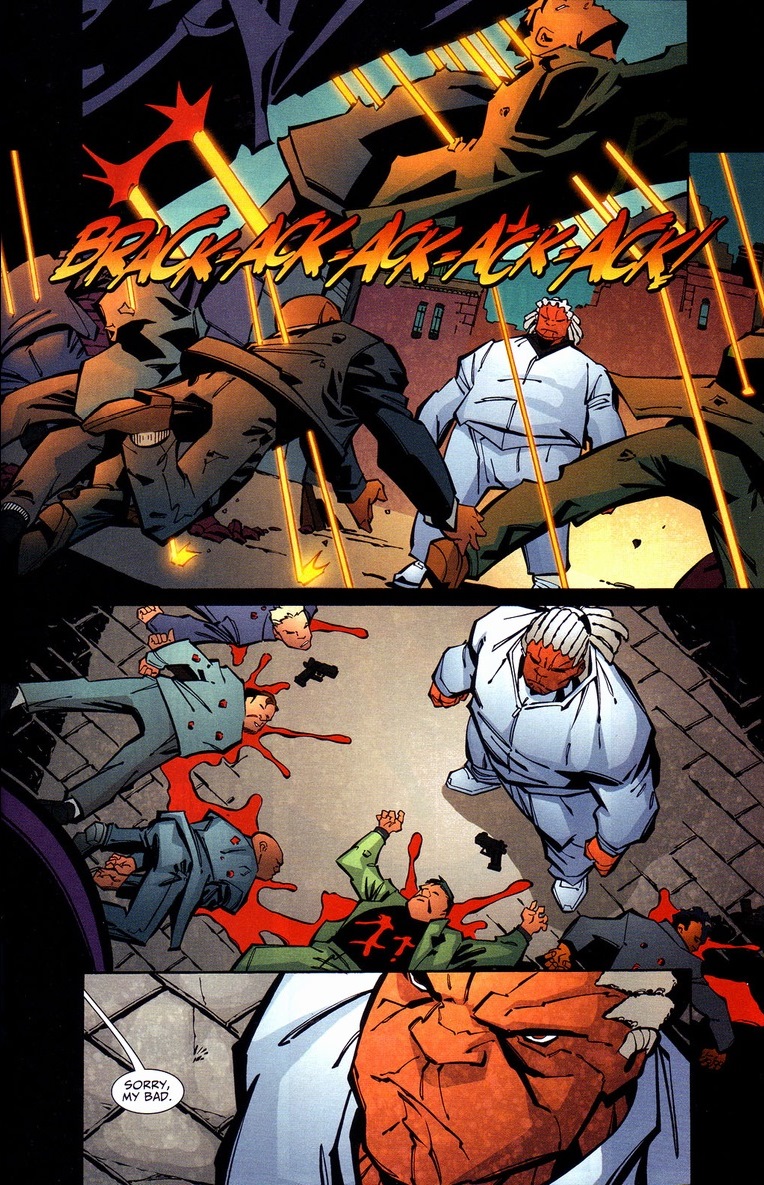 You probably already know Red Hood’s real name Jason Todd, the second Robin and current supervillain — though in the New 52, he’s evolved more into an anti-hero like a sort of lovable Punisher. Judd Winick, who writes this story, also wrote the arc Under the Hood, which brought Todd back from the dead in the first place.  If anyone has an accurate description of how the revived evil Todd should act and talk, it’s Winick.  Story-wise, Red Hood teams up with local crime boss Brick.