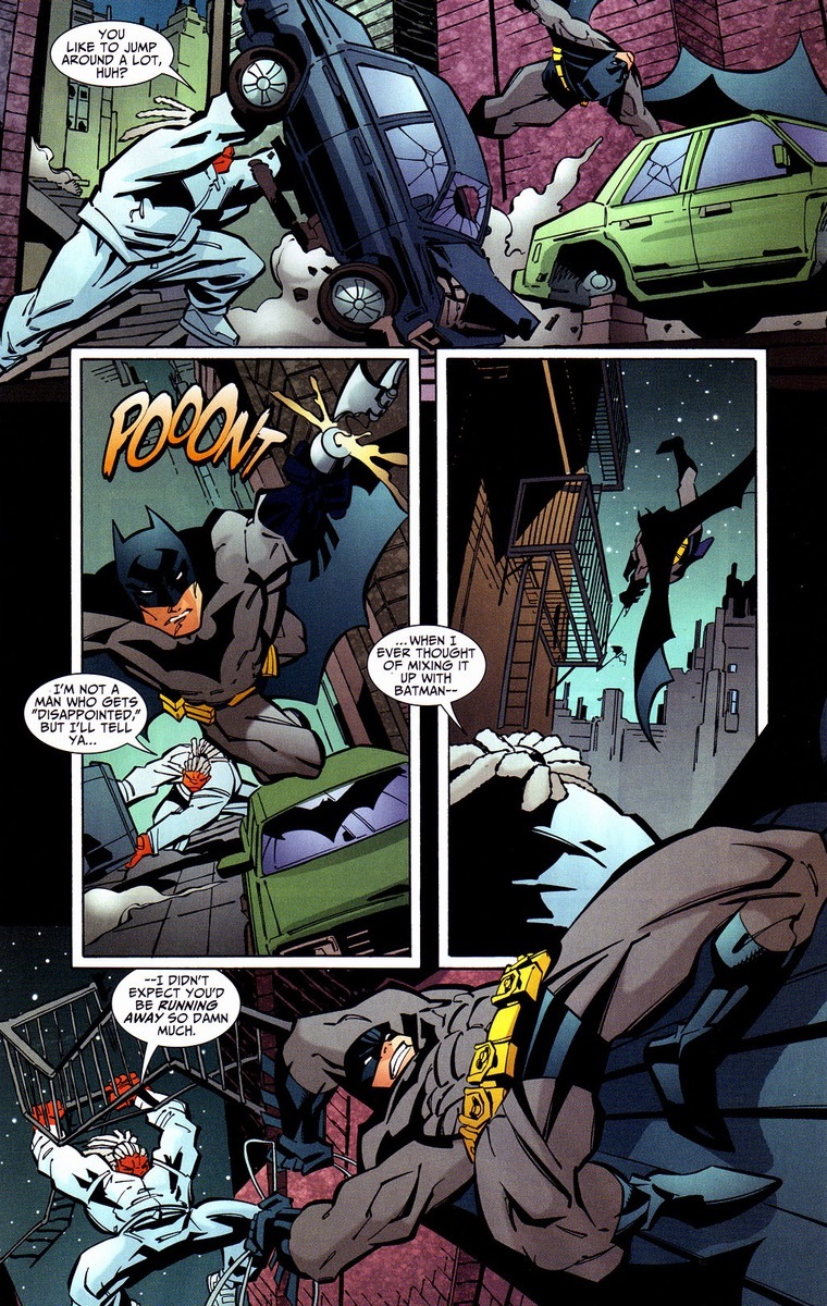 Danny Brickwell, currently known as the Star City kingpin Brick, has metahuman superpowers that give him some level of invulnerability and super strength. While not trained by Batman/League of Assassins like the verbose Red Hood, Brick still enters the battlefield as a formidabble opponent. Even against the Dark Knight, who would like to cross beat-up-guy-with-dreadlocks off his bucket list.