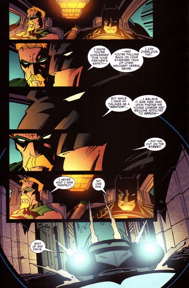 The two argue in warehouses, alleyways, rooftops, etc. — really anywhere stained with henchmen blood. Sidekicks, I believe created for child reader fantasies and to give superheroes someone to talk to, undergoes a never-ending debate of boredom, frustration, and all sorts of awful emotions. Batman has ten year-olds wearing brightly colored tights uppercutting adults. It took the Dark Knight fifty years just to give Robin pants. And Green Arrow? Besides letting his sidekick actually call himself Speedy, his buddy had the lucky honor of being chosen to participate in DC’s anti-drug campaign a few decades ago. We move on. Also, Green Arrow and Batman can totally inflict non-physical wounds as well.