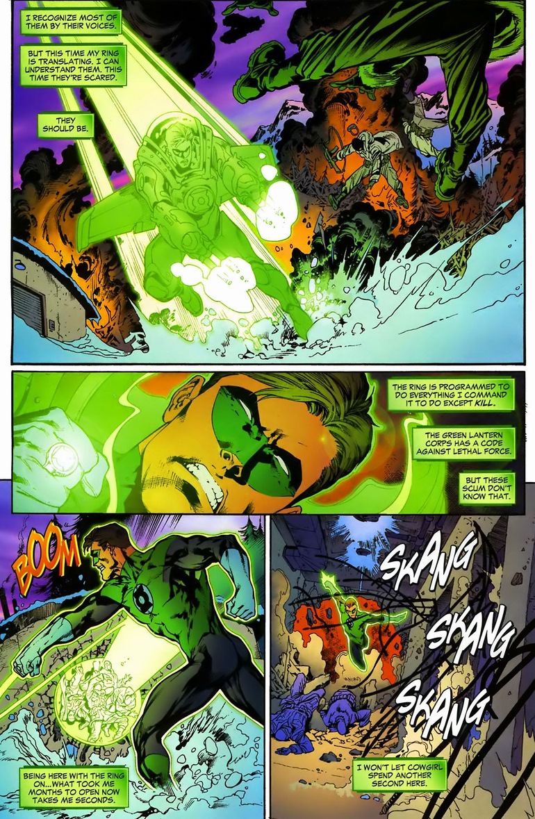 Posted: 11/03/2013 Filed under: Characters, DC 2 CommentsBruce Wayne out of the Batman suit is a world class martial artist, brilliant tactical mind, and intellectual genius. Really, the only difference between Wayne and Batman is that Batman makes criminals wet their shorts when he lands from a twelve story skyscraper and punches them in the throat. But Jordan without his ring becomes simply an above average brawler. Sure, he still has no fear and all that, but a bomber jacket isn’t a weapon that can create anything in the world. And today, he learns that lesson the hard way in Green Lantern #14-17, written by Geoff Johns and drawn by Ivan Reis.