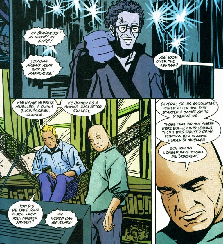 Basically, the dojo/ashram Hawke spent much of his youth in gave way to a new owner.  A greedy, new age, selfish owner.  Kung fu’s about spirituality, love, and punching, and Hawke figures it’s time to correct this problem.