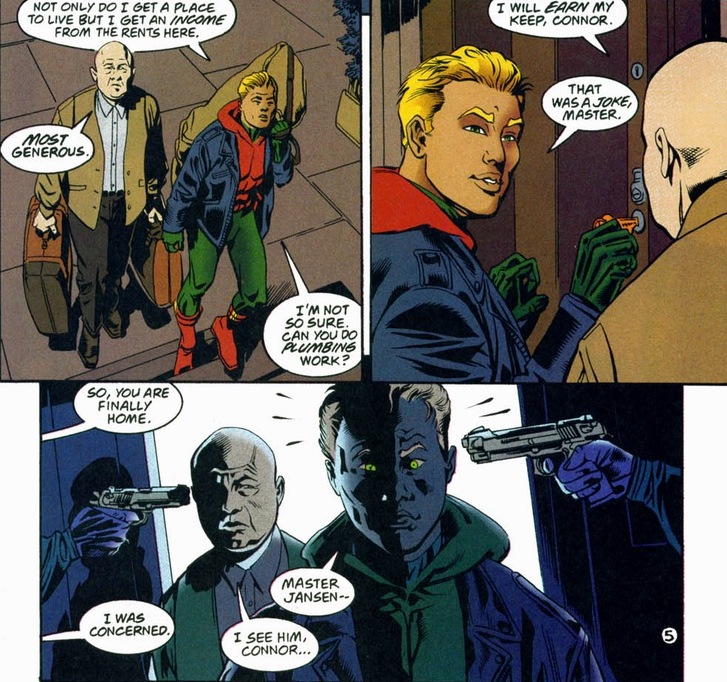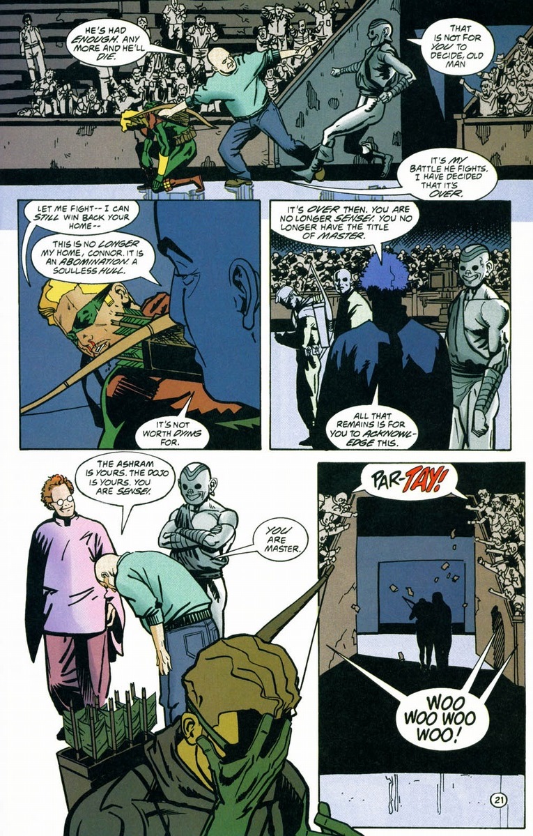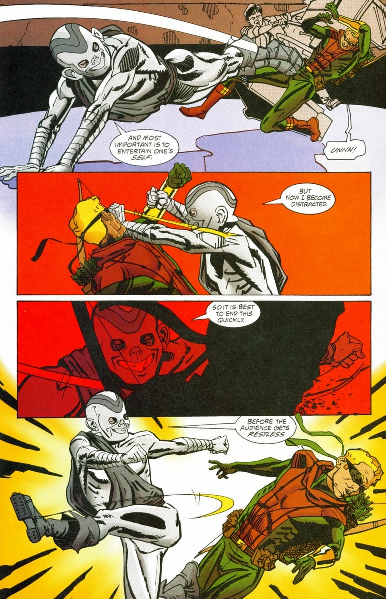Did you know Oliver Queen, the most recognizable and goatee’d Green Arrow, has a son?  Connor Hawke, a man that Queen never met until Hawke’s adulthood and raised in a dojo, took over the superhero mantle after Queen exploded in a plane.  Sad stuff.  But it turns out that shooting boxing glove arrows isn’t Hawke’s only talent — he’s also one of the finest martial artists in the entire DC universe.  I’m talking Cassandra Cain-level of kung fu aptitude.  This week, we’ll examine all the perks and annoyances of being a martial art master.  Spoiler alert: it’s entirely annoyances.  In Green Arrow #121, written by Chuck Dixon and drawn by Will Rosado, and Greeen Arrow #127, written by Dixon and drawn by Dougie Braithwaite, our protagonist battles Silver Monkey — an opponent far fiercer than his name suggests.