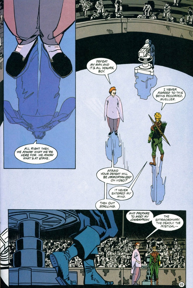 Notice Hawke’s Green Arrow costume differs from the traditional Robin Hood-esque outfit that Queen wore.  Also, if you notice Hawke out of uniform in the first page, he’s a mix of Asian, African, and Queen’s European heritage — a wonderful role model for those seeking a non-white superhero to identify with.  Oh, and Fritz Mueller’s champion?