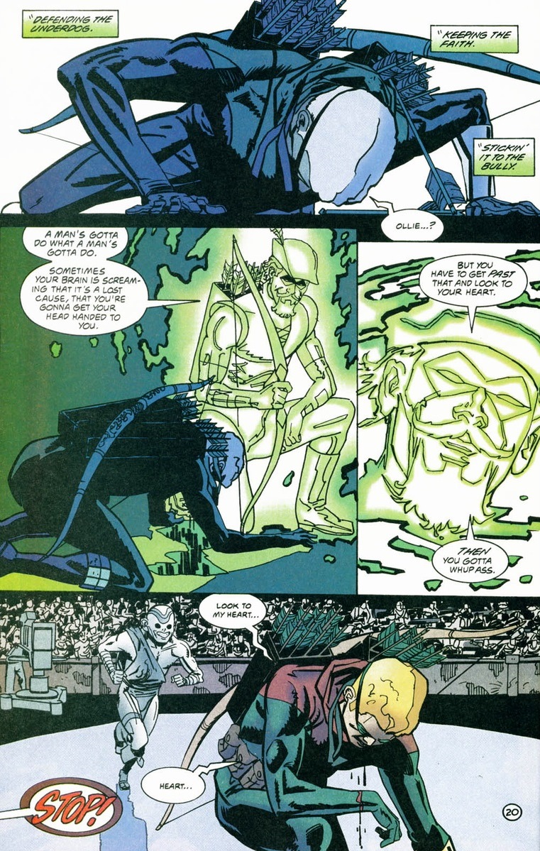 This fight scene combines my two favorite things: brawling and lectures on crowd mechanics.  I don’t know why Green Arrow brings his bow with him.  Or why he only has one bracelet.  But just like every great martial arts movie, when our hero gets down, all he needs for his second wind is an incoherent ghost speech.  I feel after a few massive blows to the end, it’s more the tone than the message that matters anyway.