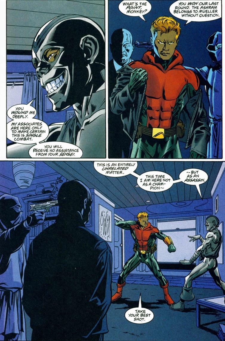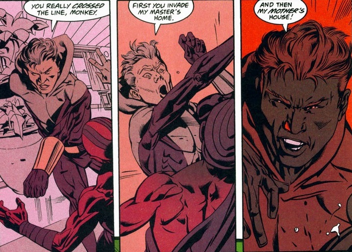 Most superheroes keep their costumes on underneath their clothes, but Hawke just puts on a jacket. Now y’see, martial arts work looks impressive, but it rarely pays the bills. Sure, Silver Monkey could teach all those fancy moves to preteens and whatnot, but that’s more of a studio apartment than a life of luxury. So to support that glorious lifestyle he leads as an arrogant asshole, Silver Monkey takes the route most traveled by comic book supervillains who dabble in kung fu.
