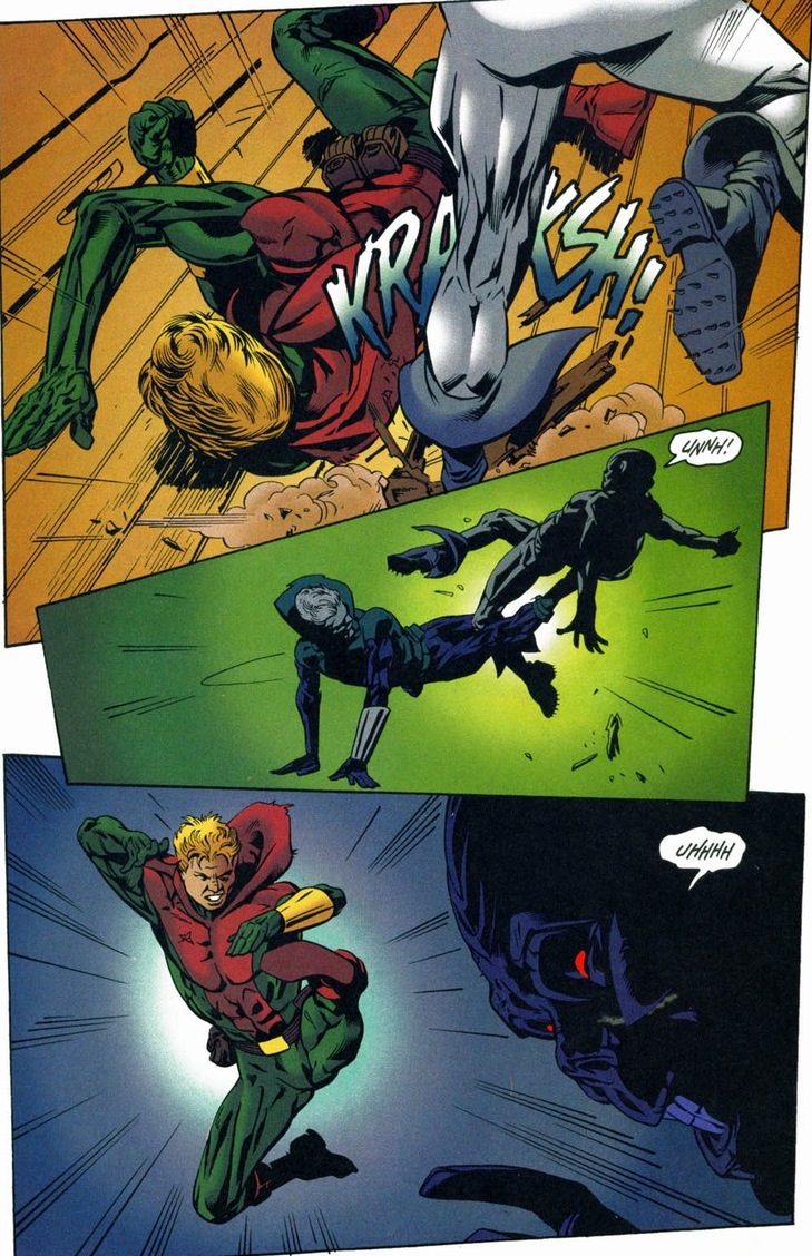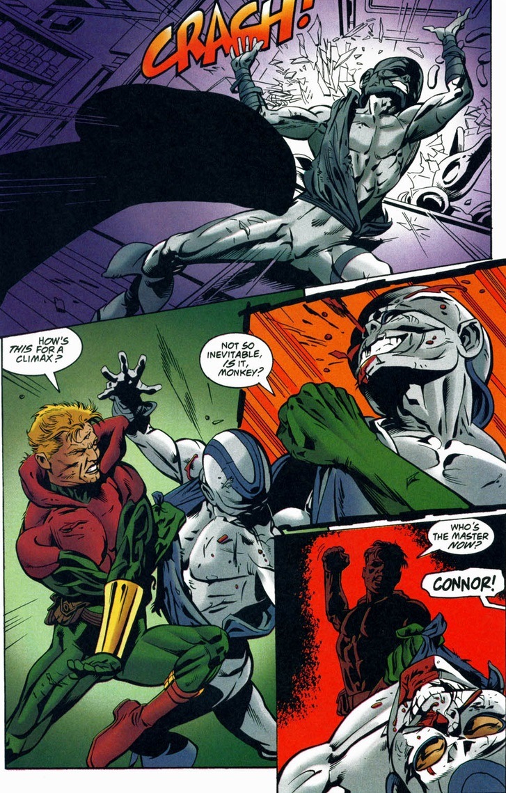 Posted: 11/06/2013 Filed under: DC, Fights 1 CommentAs we watched the Silver Monkey humiliate Green Arrow last time, the unfortunate first loss — used to show the superiority of an enemy and thus heighten the suspense for our dear superhero — must be a predecessor to the exciting and inevitable rematch. We pick up with round two of Connor Hawke versus Silver Monkey: