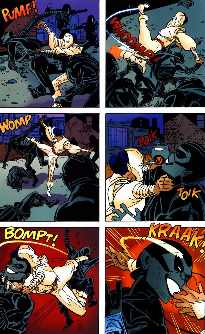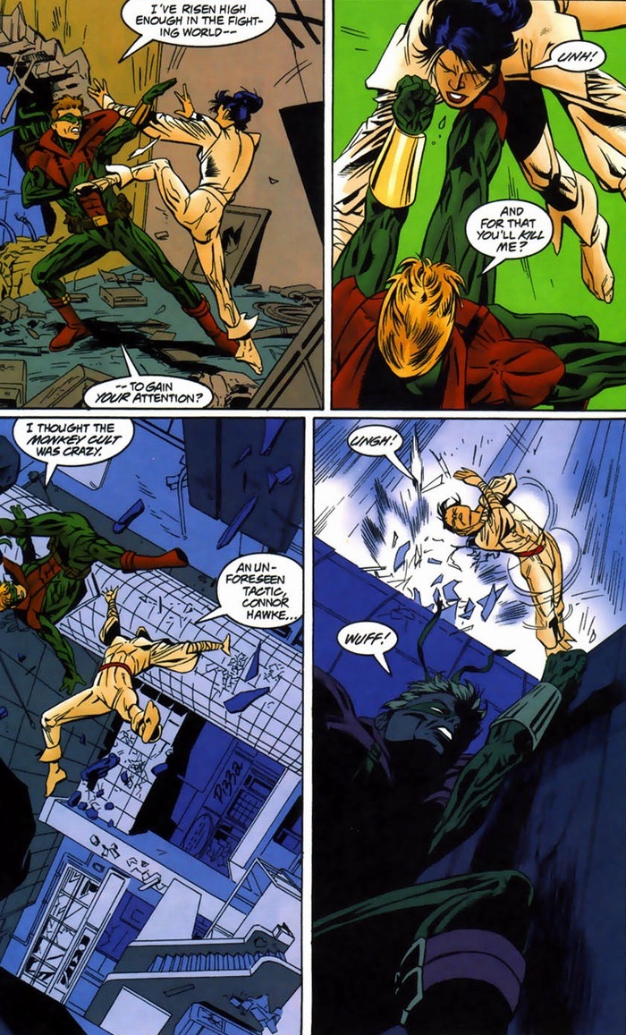 Posted: 11/07/2013 Filed under: DC, Fights Leave a commentYou’ve just seen two days of Connor Hawke (using the Green Arrow title after his father exploded) karate chopping Silver Monkey through all sorts of destructive environments. But no more Silver Monkey. Now, his fellow apes get given the task of taking down the new Green Arrow. Over a five issue story, crossed over with the Batman titles, Hawke has to prove his worth against the deadliest assassin of them all. She’s scary.