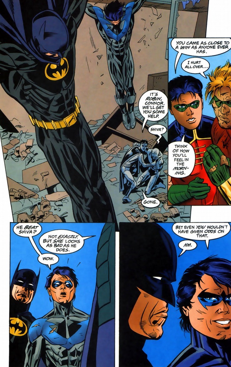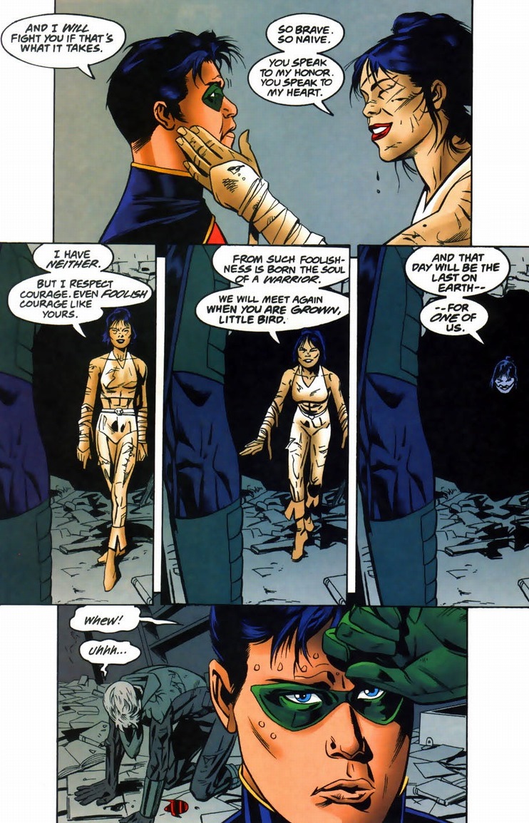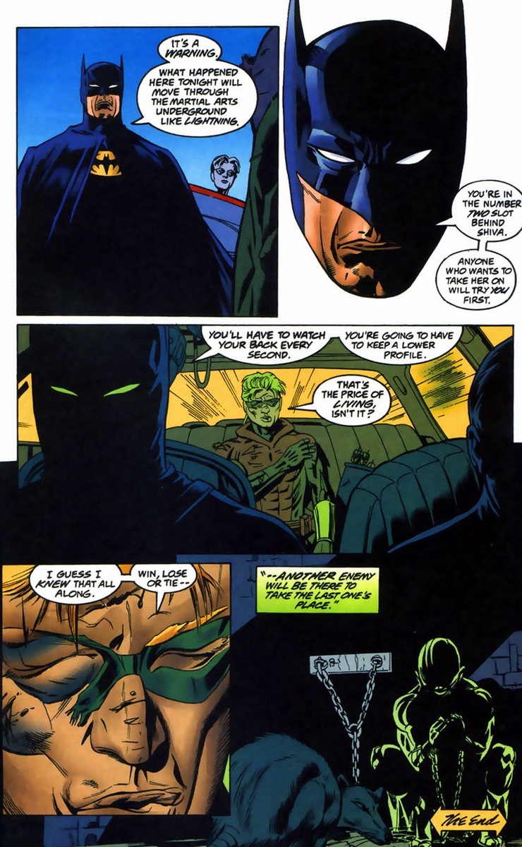 He loses. Everyone loses to her. Turns out when I did some research, Leopard Blow totally exists as a real fighting move. Whether it can kill someone remains to be seen, though humans tend to be pretty soft and squishy. Remember how I said Lady Shiva trained Robin back in the day? And how the Batman family defeats her using their mind and not lethal animal punches?