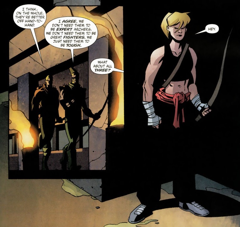 Step two: training. But I’m going to skip all that. Still, with time being the essence and Oliver Queen and son being the only skilled archers in the group, wouldn’t an extra hand be a nice boost? Like say, the HIV-positive teenager living in Queen’s house who has spent her every waking hour smashing bullseyes?