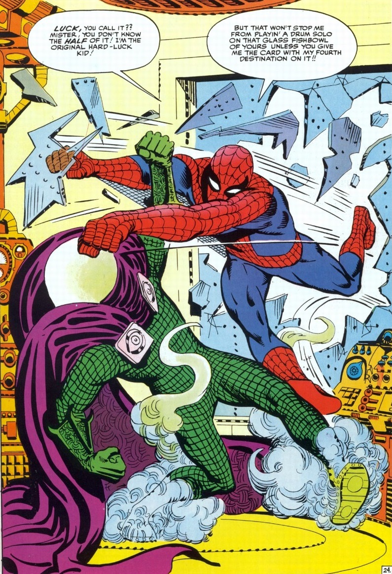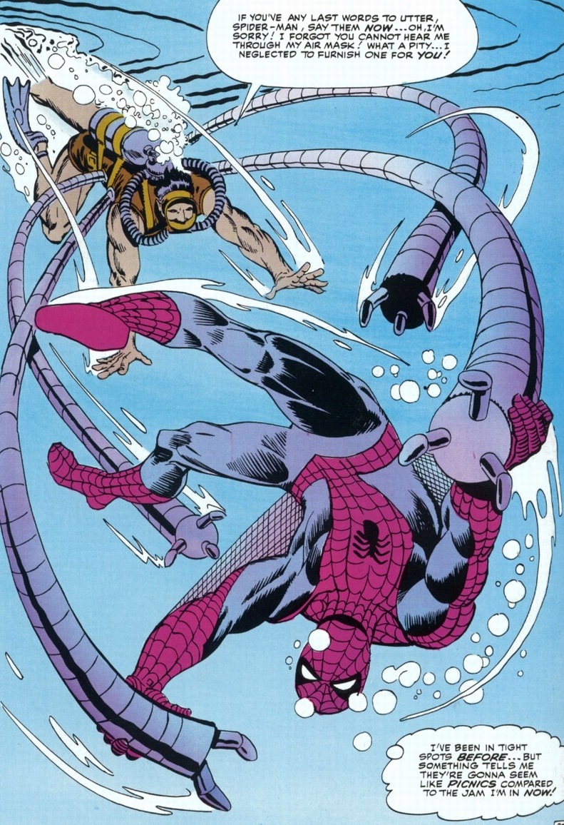 Way back in 1964, Spider-Man (actual Peter Parker) first met the Sinister Six led by Doctor Octopus (actual Doc Ock) in Amazing Spider-Man Annual #1, written by Stan Lee and drawn by Steve Ditko. The success and praise from this issue comes from a brilliant artistic choice: every time Spider-Man lands the finishing blow (or close to it), we get a gorgeous full page punch. You’ll see.