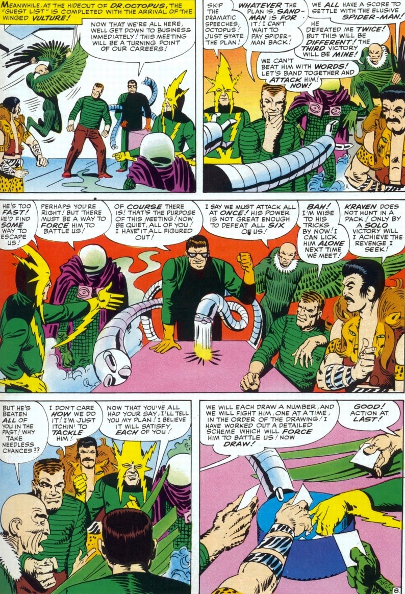See? Spider-Man and his buddy Sun Girl versus Sandman, Vulture, Electro, Chameleon, and Mysterio. Notice only five supervillains? Y’see, Doctor Octopus (currently inhabiting Peter Parker’s body) assembled them to form his own superhero team. It turned out badly.