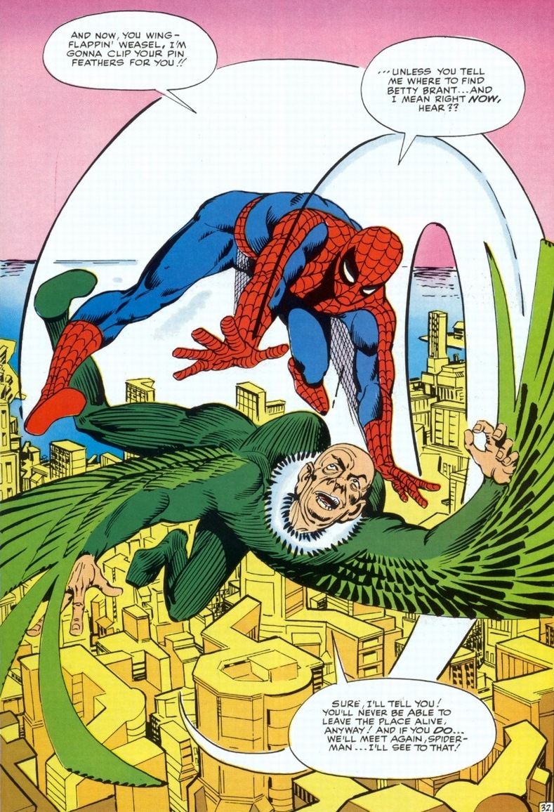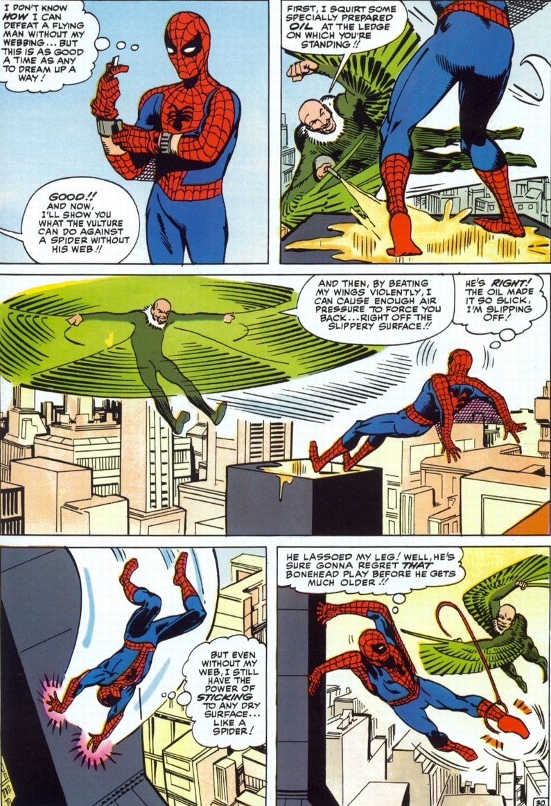 No one tell Vulture that an old man in a bird costume doesn’t classify him as “the most dangerous of all.” Also, add spider-lassoing to Spider-Man’s set of skills. The 1960s were really a wonderfully silly times for comics. Now while Spider-Man obeyed the conditions of the fight, Batman would have just slammed Vulture’s head into the sidewalk until he talked. Different strokes and whatnot.