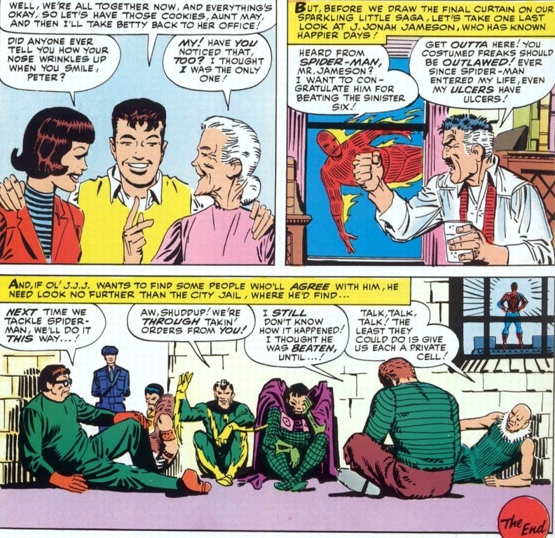 So if you’ve been reading the beautifully cheesy 1960s dialogue, Spider-Man has no superpowers. I don’t know why, but that side plot gets resolved in two pages, so I wouldn’t think too much on it. Also, I love that J. Jonah Jameson assumes Spider-Man’s illiterate.