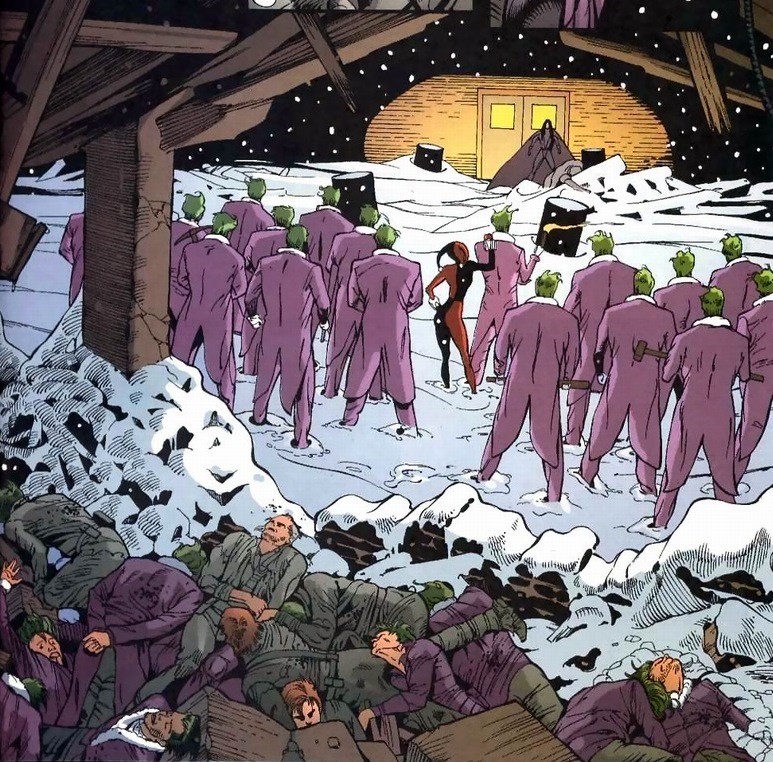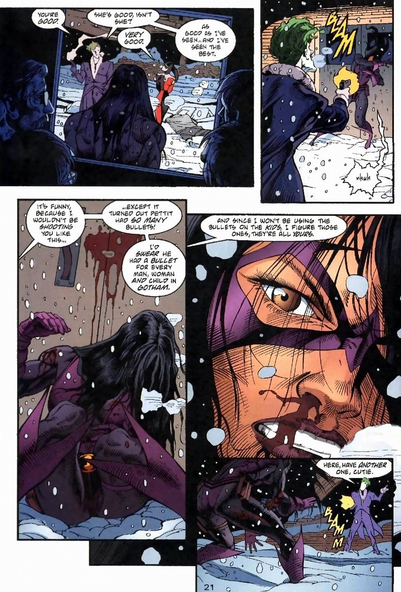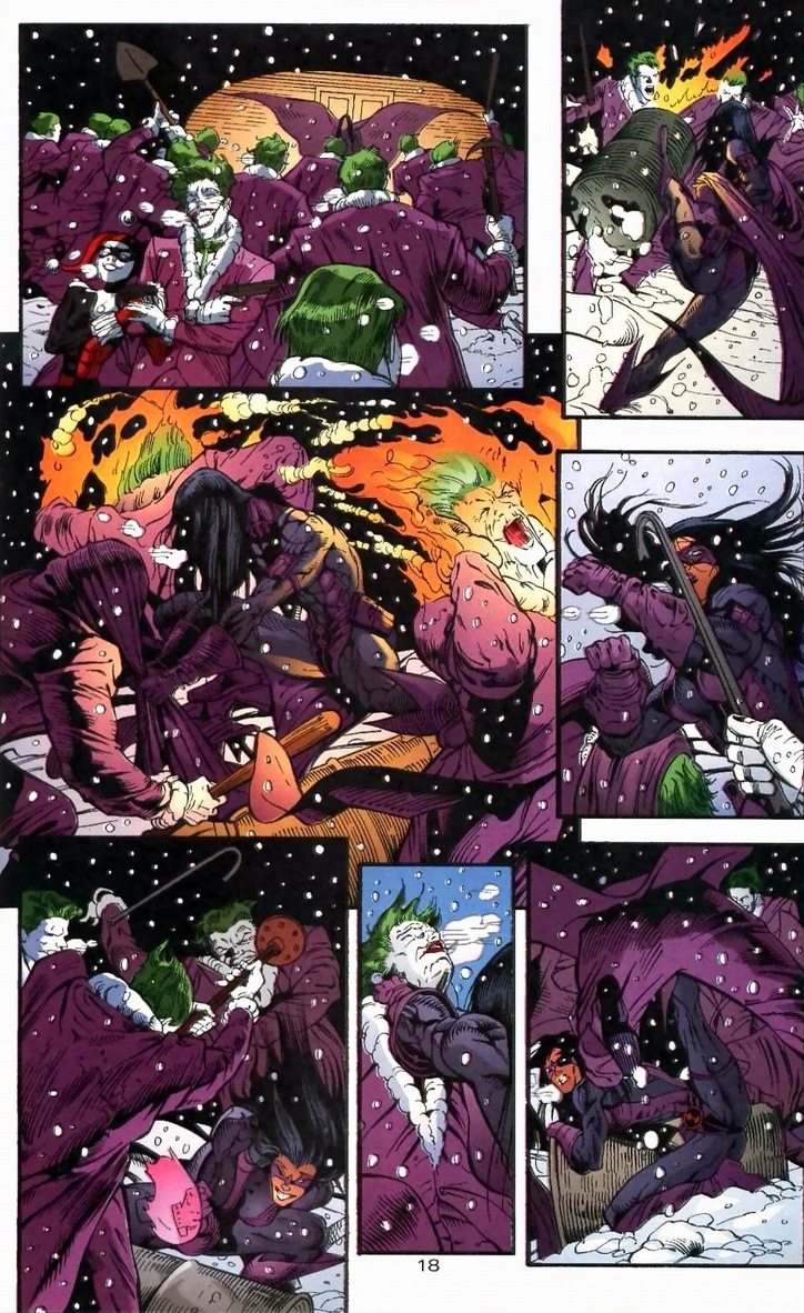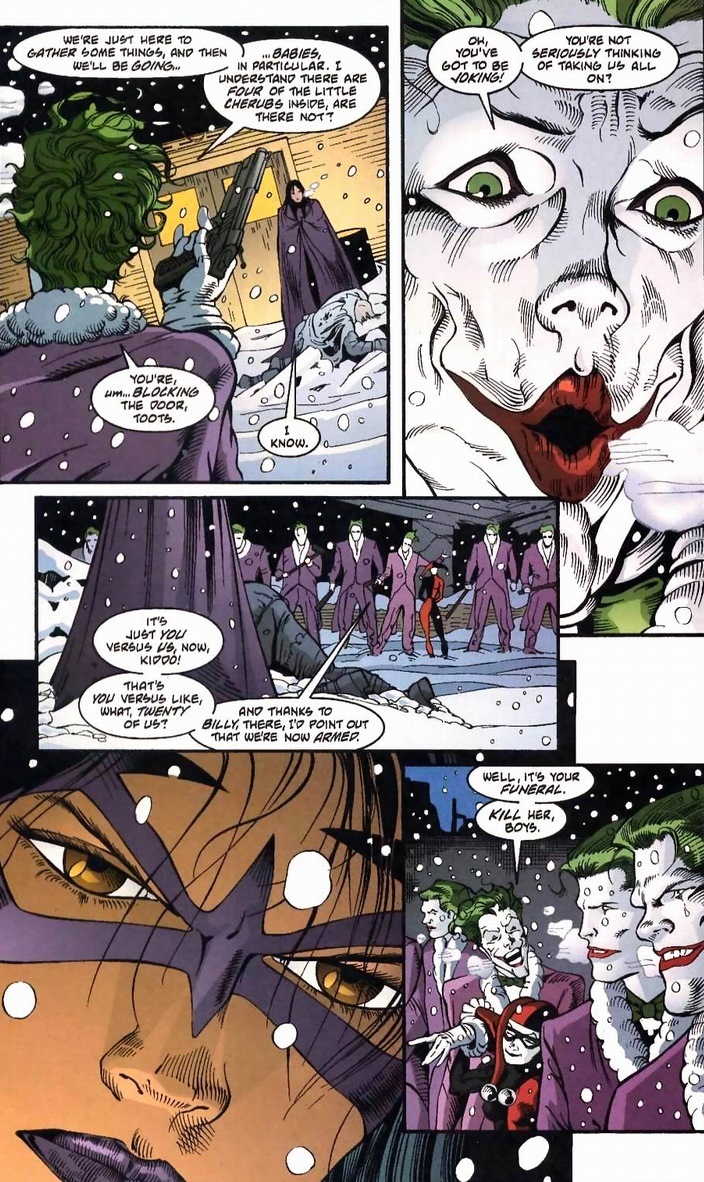 I’m going to skip Petit and gang’s battle against the Joker.  Essentially, Joker has both cops and henchmen dress up in identical Joker costumes, forcing Petit and friends to kill their own men attempting to shoot the real deal.  Finally, Huntress stands alone.  Against a dozen criminals and two supervillains. Did I mention she has no superpowers?