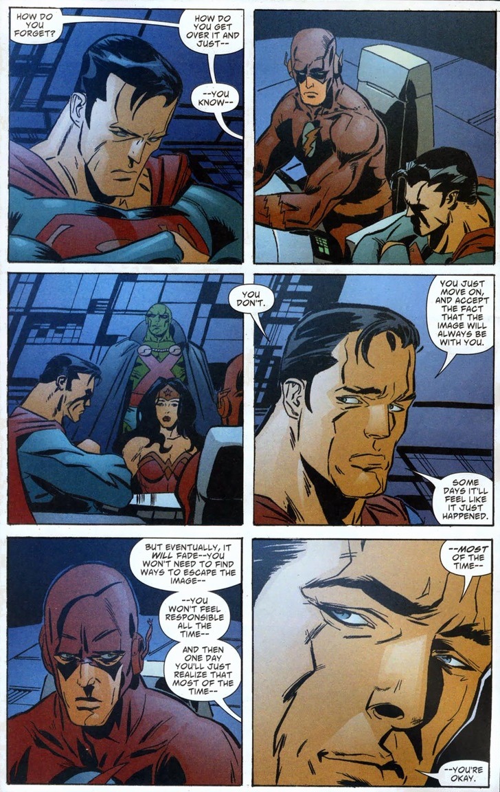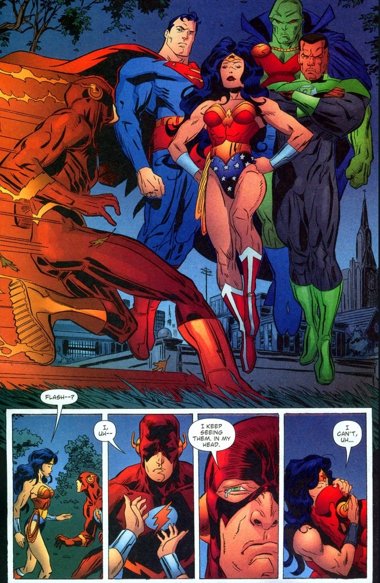 Posted: 12/17/2013 Filed under: Characters, DC 1 CommentWe continue our depressing series with the Flash (real name Wally West), who despite being probably the most lighthearted member of the league (assuming Plastic Man isn’t around), takes emotional turmoil like a broken ankle — bunches of tears, whimpers of despair, and a dramatic collapse to his knees. While superheroes are supposed to be tough and unflappable and all sorts of heroically masculine traits, the importance of a superhero’s traumatic breakdown cannot be overstated. Especially in DC, where I’ve mentioned before that the big timers tend to lack that essential fatal flaw that makes them relatable (Batman excluded because he’s irreparably emotionally damaged). To have these moments where superheroes fail so brilliantly (or witness something similar) allows us to like them more — look, I’m aware I can’t kick bad guys into space, but it’d be nice to know that at least my fictional heroes also stub their toe on the coffee table once in a while. Today let’s enjoy JLA #102, written by Chuck Austen and drawn by Ron Garney.