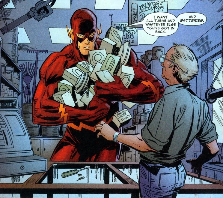 Remember that South Park episode where the kids pretended to be superheroes? They would stand outside supermarkets and sell baked goods to raise money for all the Cthulhu destruction. Flash does something similar, though with less cooking — I think he’s probably been around enough enough heat for a few days. Ever want to see the Flash lecture civilians on proper maintenance of smoke detectors in a canon comic?