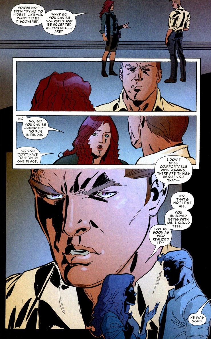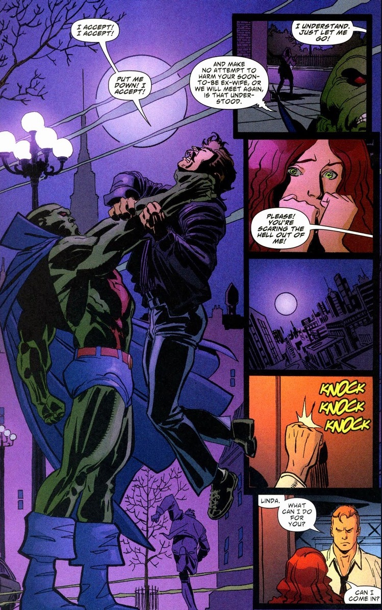 Of course the universe’s last Martian would be a bit unhinged. I don’t even think it’s an afraid-to-fall-in-love-again thing. Or a wishing to feel like the victim mentality. Here’s my take with zero research to back it up: unlike Superman, who plopped onto earth as a child and therefore raised as a normal-esque boy, Martian Manhunter arrived on this planet full grown in the prime of his life. If he accepts that he now possesses some glorious earth traits, it’s a cultural slap in the face of his previous life. After all, he’s all that’s left to preserve the Martian culture. By assimilating, the memory of his wife, child, and people fade with each new girl he kisses or every time he hugs the Flash.