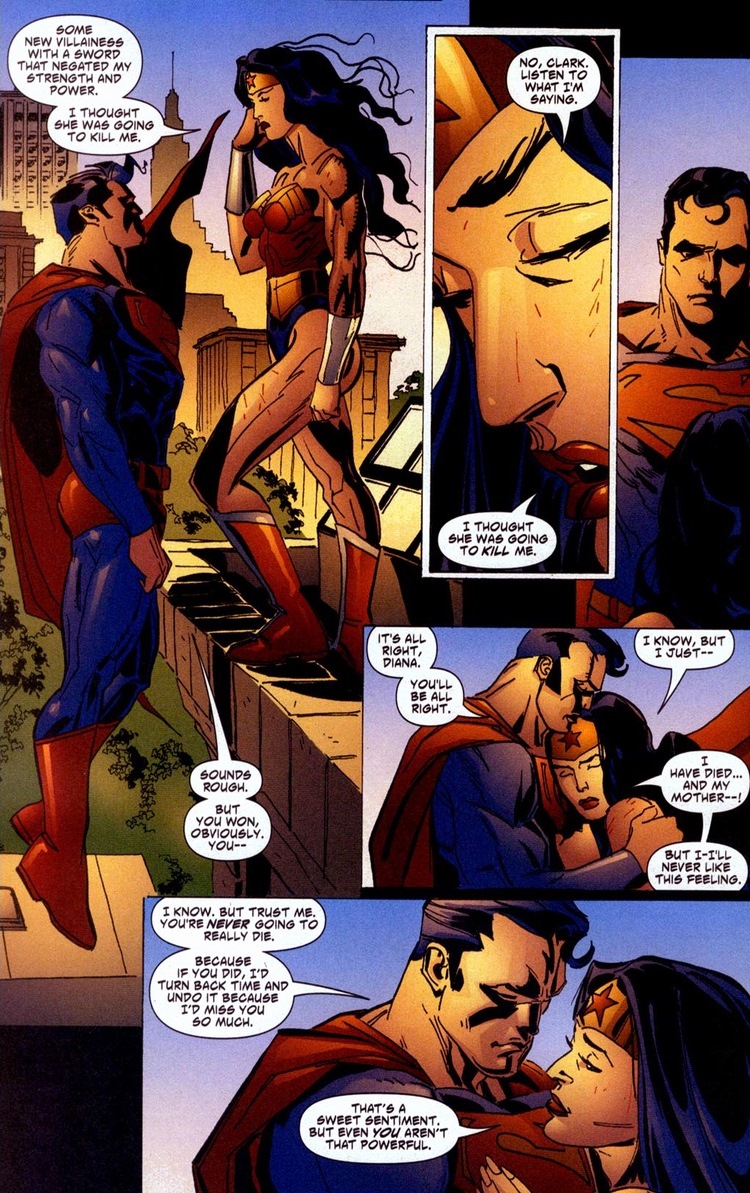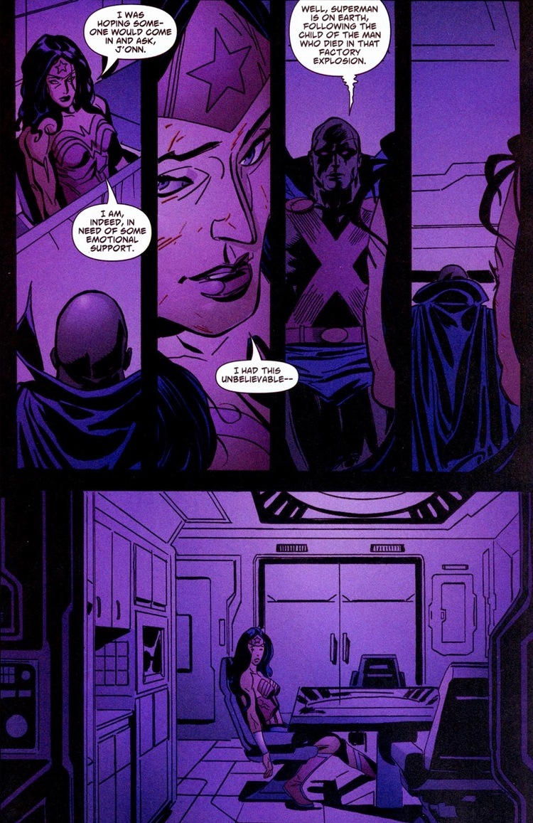 Maybe Martian Manhunter is just concerned she’ll bleed all over the furniture. Look, despite the martian’s revelations last issue, not everyone adjusts as fast as the Man of Steel. Superman’s better than all of us for a reason. Remember Superman’s mistake back when he let a new superhero accidentally explode? Y’see, he feels he has a duty to watch the kid play or whatever while he hides in trees and hovers above him. It’s supposed to be sweet and not creepy. Especially because of what happens next. But before all that, Superman can do more than laser vision baddies or create cyclones — he can heal broken hearts as well. Also, we knowing that Superman and Wonder Woman are currently dating in the New 52 makes this moment far more sentimental: