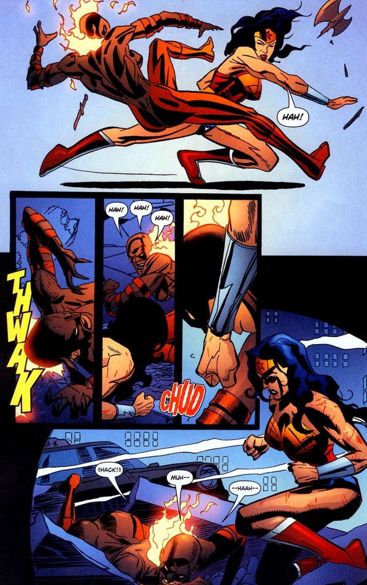 Posted: 12/25/2013 Filed under: Characters, DC Leave a commentMerry Christmas! What better way to enjoy a day of peace, happiness, and a slight buzz than with Wonder Woman’s turn for an emotional breakdown? Luckily in JLA #105, written by Chuck Austen and drawn by Ron Garney, our Amazonian takes up half the issue with a fight — the way I like my Wonder Woman (awesome).