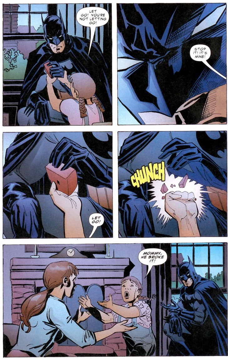 Okay, so today’s going to be a shorter article than normal. The final issue of the arc spends the majority of its pages wrapping up that whole superpowered kid story you saw last time. Plus, if you’ll allow me to make excuses, I’m still fairly sick and I’m moving tomorrow. But let’s be fair: Batman’s entire narrative drives from watching his parents’ shooting anyway — and that’s about as emotionally destructive as one can get. I mean, everything he’s done since that moment has been to avenge their deaths (and a never-ending breaking of criminals’ jaws). So with all of Batman’s lessons already learned, he can concentrate on the more important things. Like playing with children.